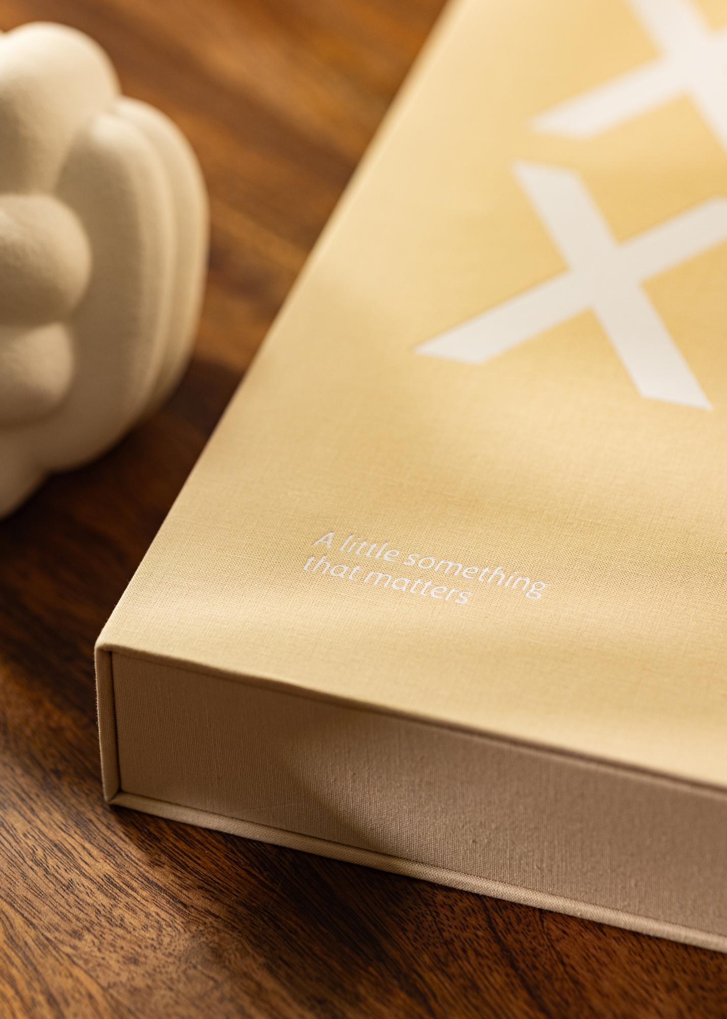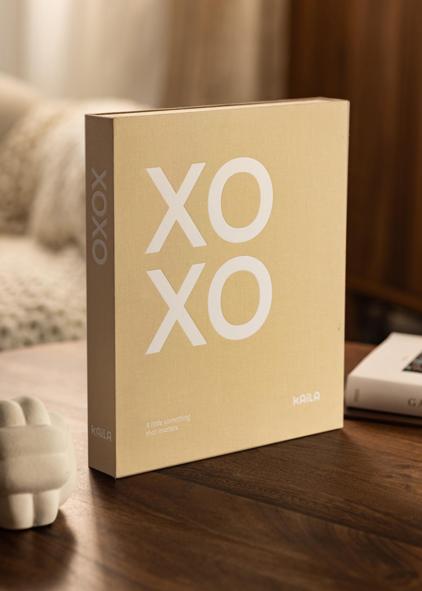 Este elegante álbum de fotos está diseñado como un moderno libro Coffee Table y también se conoce como un Álbum de Fotos Coffee Table. La cubierta está elegantemente vestida con tela beige y en la parte delantera y en la espalda del álbum hay una impresión en blanco con el conocido saludo de despedida "XOXO", que significa besos y abrazos. Este título moderno también se complementa con un subtítulo que dice "Algo pequeño que importa" y está impreso en la esquina inferior izquierda del álbum. Es un álbum de fotos muy elegante con un diseño diferente y jovialidad que seguramente se destacará entre los demás.