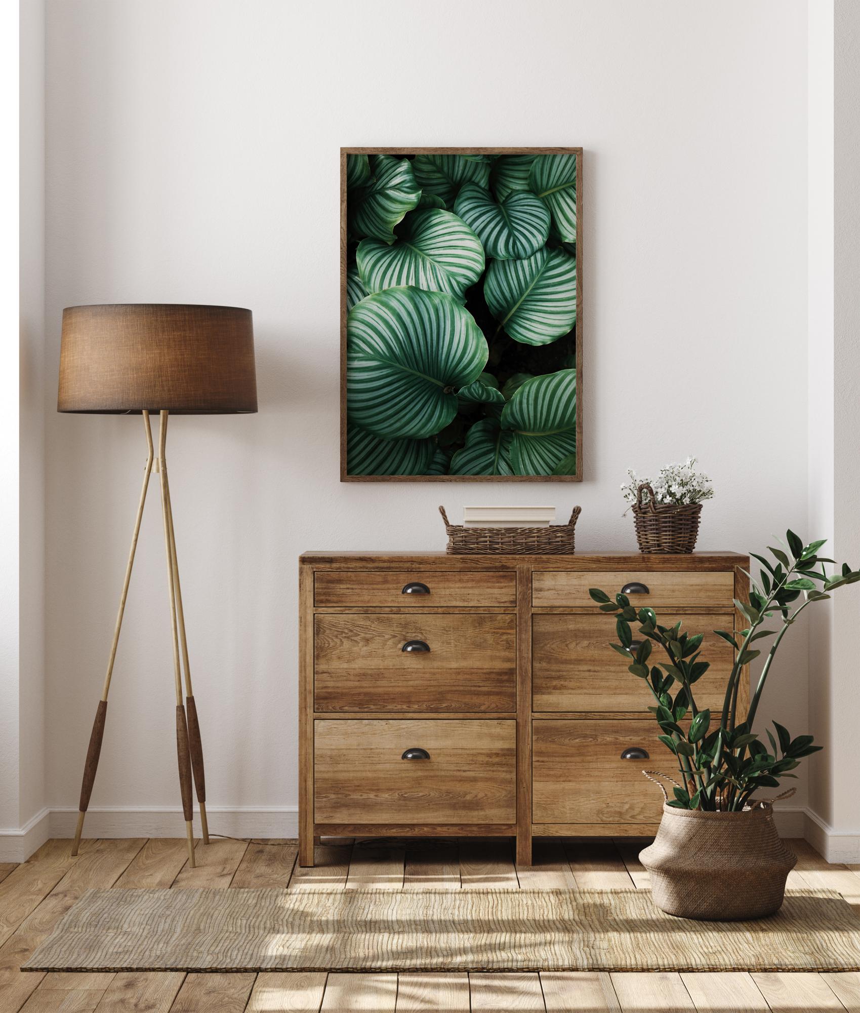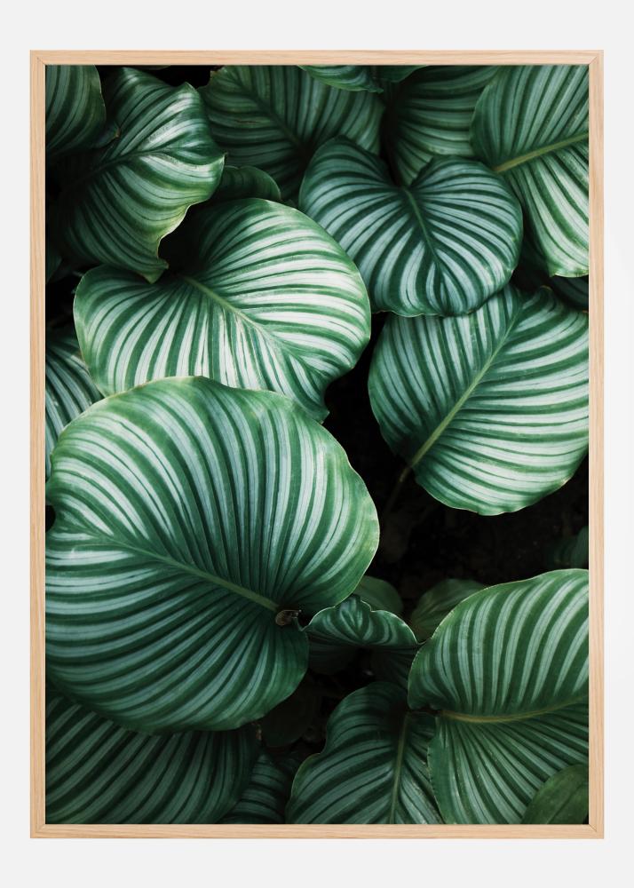 Un hermoso póster en perspectiva de pájaro con hojas oscuras y verdes de una calatea. La luz del sol brilla sobre las hojas y crea una luz penetrante. Diferentes tonos de verde crean un ambiente intenso, lo que hace que esta sea una imagen perfecta para colgar rodeada de plantas en una sala de estar.