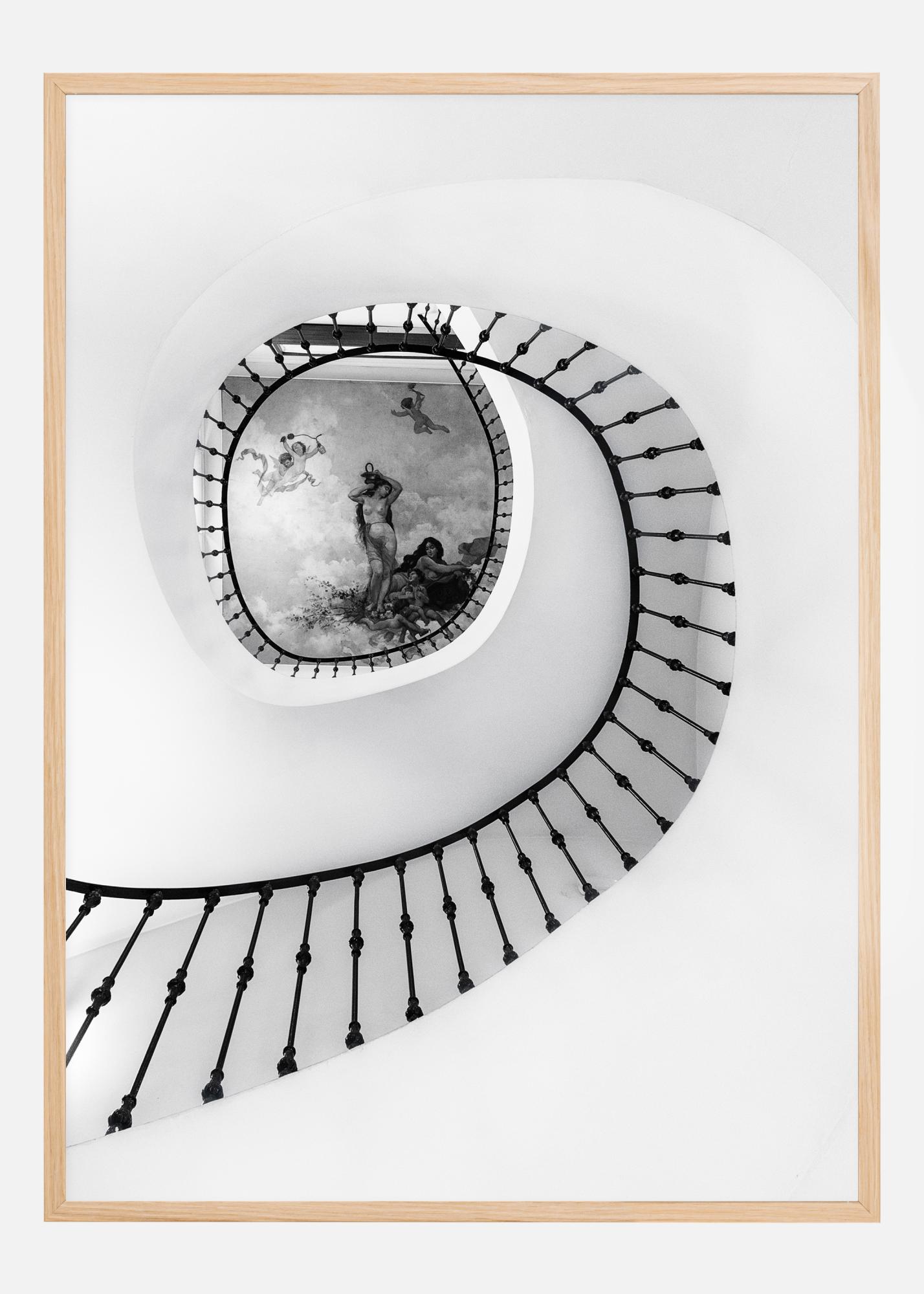 Un hermoso póster en blanco y negro con una escalera de caracol. Gracias al pasamanos negro de hierro forjado, esta hermosa escalera de caracol te lleva a una maravillosa pintura mural con mujeres desnudas y querubines. Cuelga esta impresión en una sencillo pared blanca y crea una sensación de infinito.