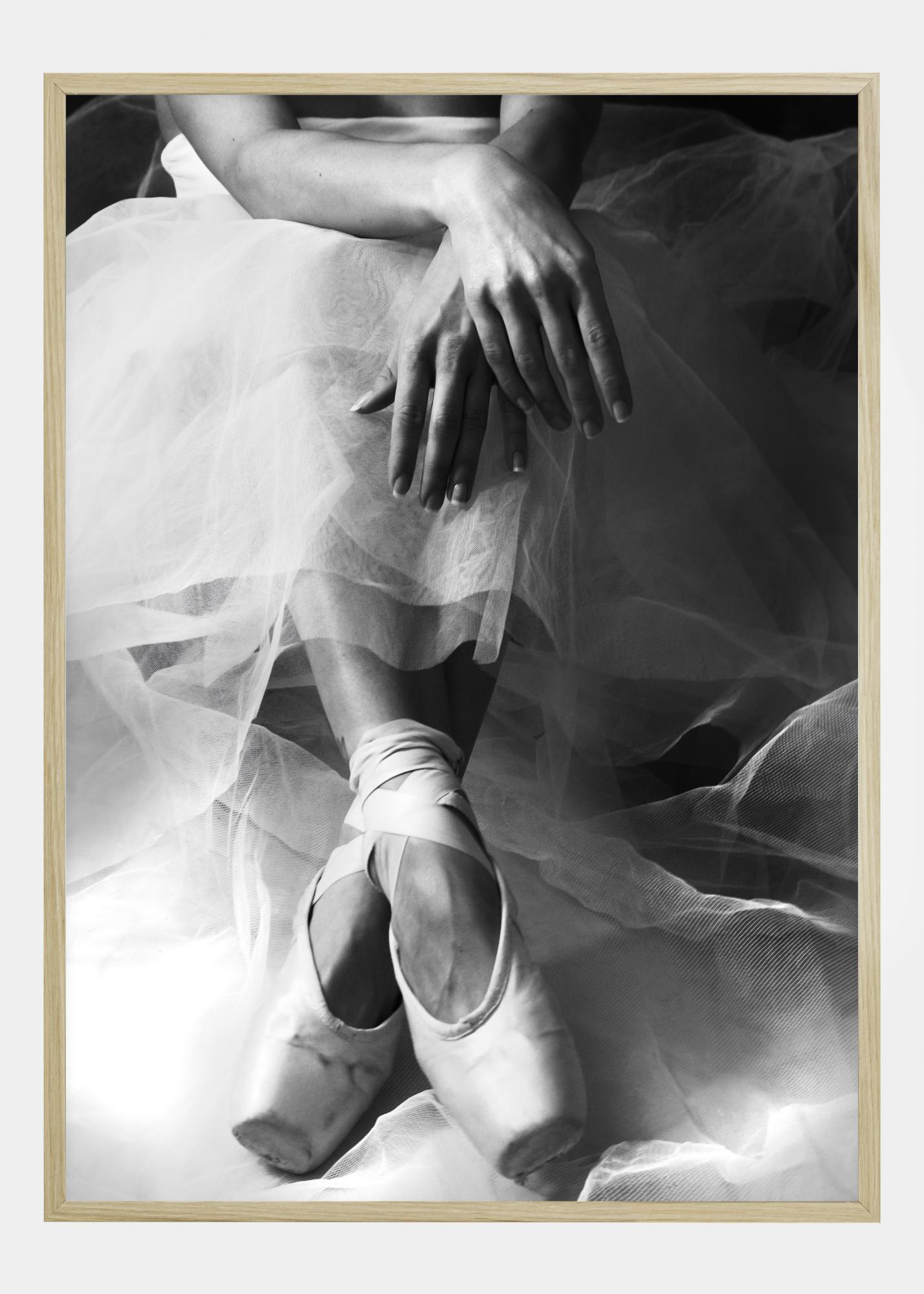 Un elegante póster con una bailarina posando sentada frente a una danza. Sigue los pies y las manos cruzadas mientras espera su turno. Este póster queda perfecto en una pared neutral.