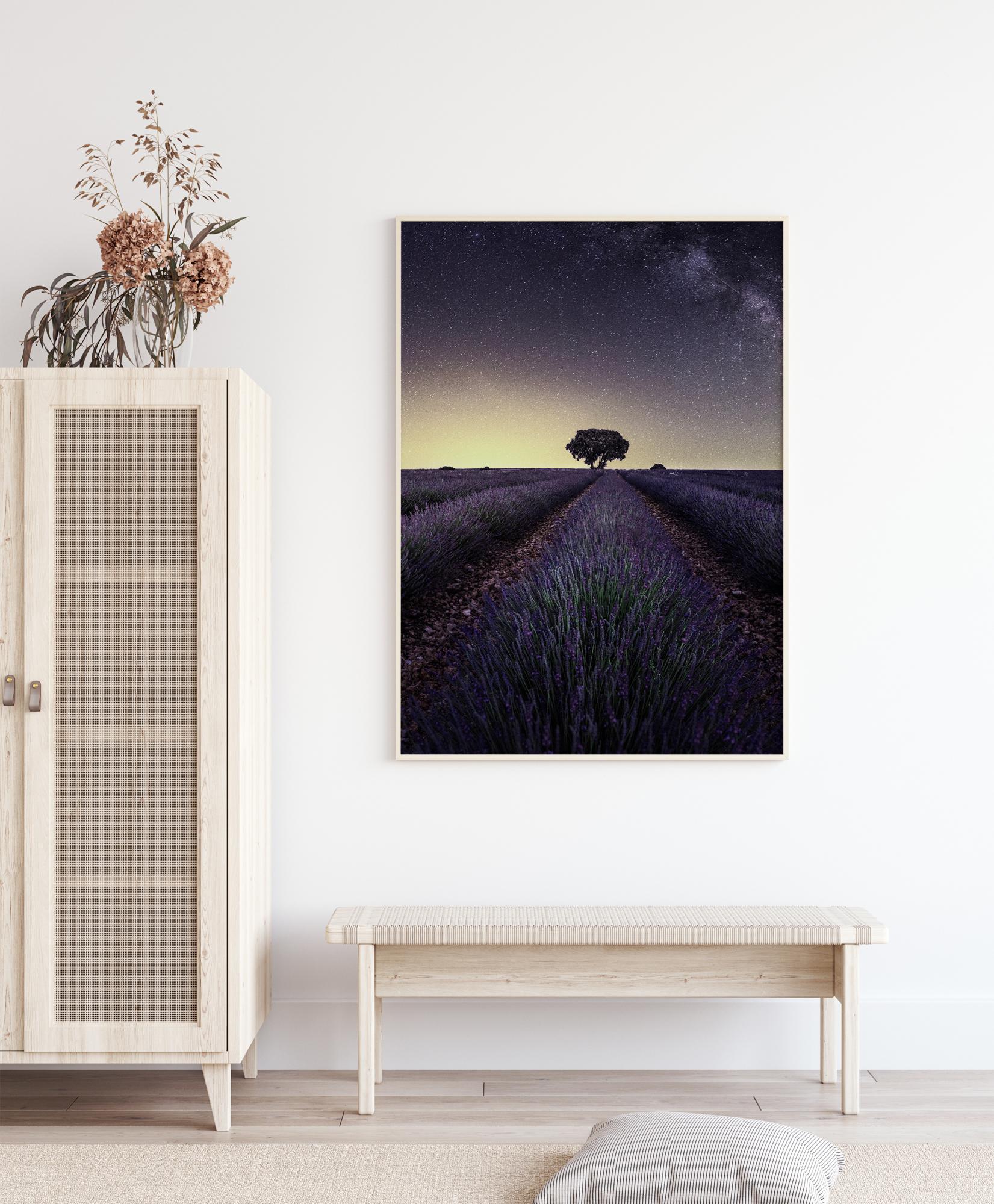 Un póster encantador de un campo de lavanda. Los intensos tonos del color lila de la lavanda, perfectamente combinados entre sí, bailan en la brisa de la mañana. Un árbol solitario es iluminado por el sol de la mañana temprano y complementado por el oscuro cielo estrellado. Cuelga esta impresión en tu cocina para crear un ambiente natural.