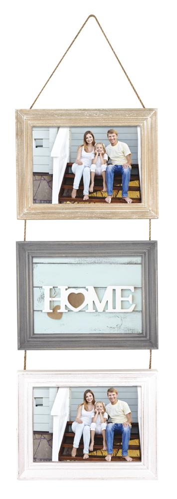 Llena tu hogar con fotos enmarcadas de tus seres queridos para crear un ambiente cálido y acogedor. Este marco de estilo rústico puede contener tres de tus mejores fotos horizontales en formato 10x15 cm. Los marcos son de color madera, gris y blanco con detalles desgastados. Se mantienen unidos con una cuerda decorativa fina que también se utiliza para colgar fácilmente.