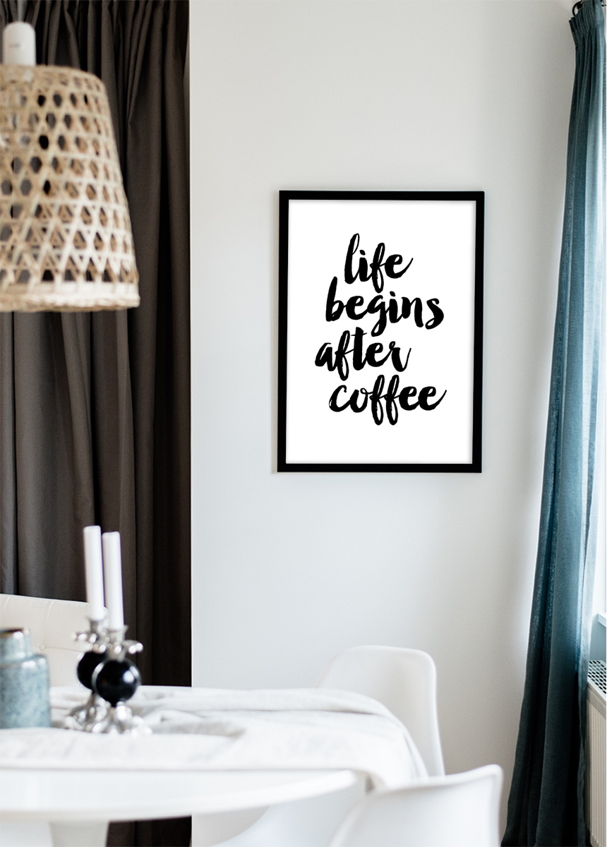 Sabes que te irá bien en el trabajo hoy y que incluso después tendrás energía para pasar tiempo con tu familia y amigos. Pero de hecho, antes de poder hacer todo esto, necesitas una taza de café estimulante. ¡No hay nada de qué avergonzarse! En su lugar, cuelga este hermoso póster en la pared y disfruta de una taza de esta maravillosa bebida. El póster es blanco con una impresión en negro en forma de texto "La vida comienza después del café" escrito con una fuente juguetona y enredada. Los cuadros de cocina suelen quedar muy bien con marcos plateados que combinan con el fregadero, el grifo y otros detalles metálicos que suelen haber en una cocina. El póster está disponible en varios tamaños y rangos de precios.