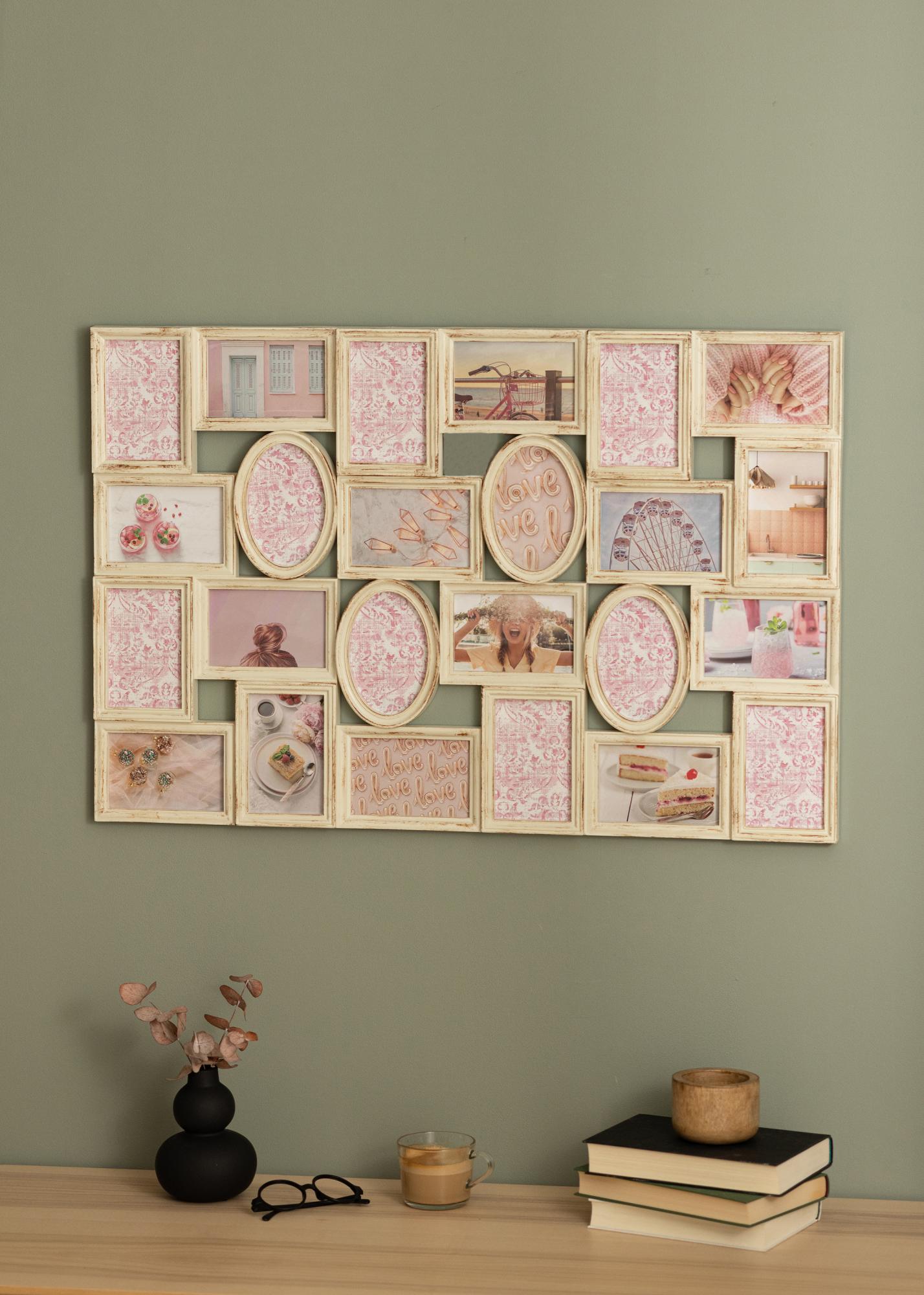 Este es un marco collage en estilo romántico, con un tono crema y un aspecto bellamente desgastado. Tiene capacidad para 24 fotos de 10x15 cm, lo que te brinda mucho espacio para colocar todas tus fotos favoritas. Las imágenes se colocan en pequeños marcos, que tienen forma rectangular u ovalada. La mezcla de las diferentes formas le da al marco una expresión única y juguetona.
