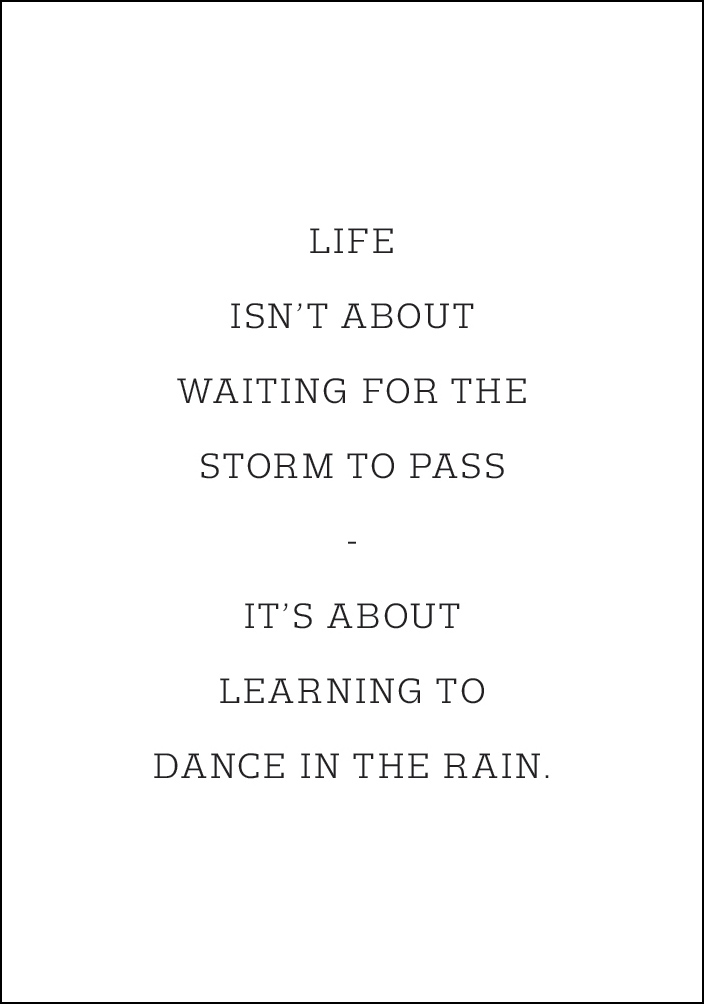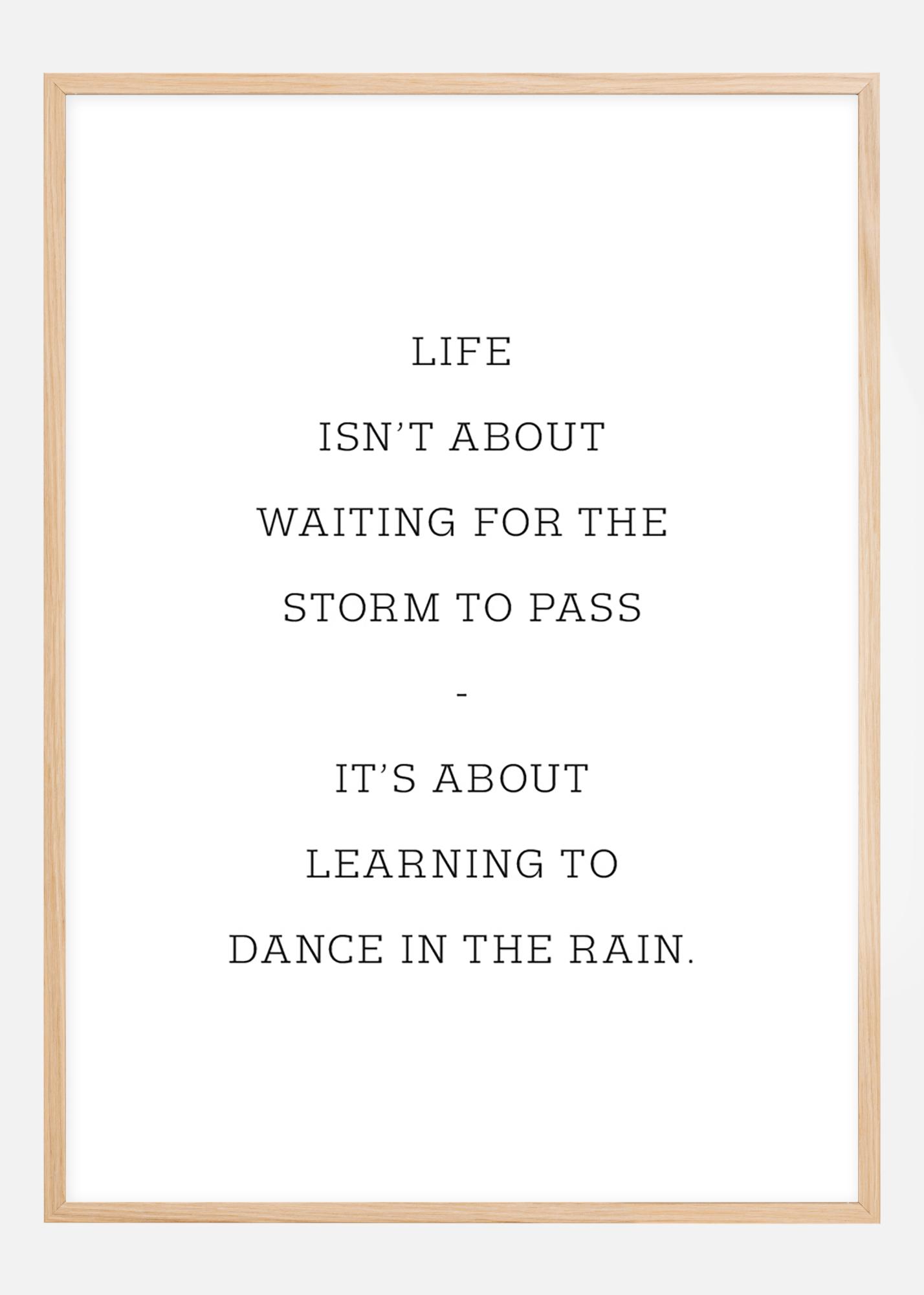 Una impresión motivadora en blanco y negro que resalta la importancia de enfrentar los problemas. Escrito con letras negras sencillos y en negrita, el mensaje se destaca claramente. La vida no se trata de esperar a que pase la tormenta, se trata de aprender a bailar bajo la lluvia. Un póster sencillo pero moderno para colgar en una pared blanca.