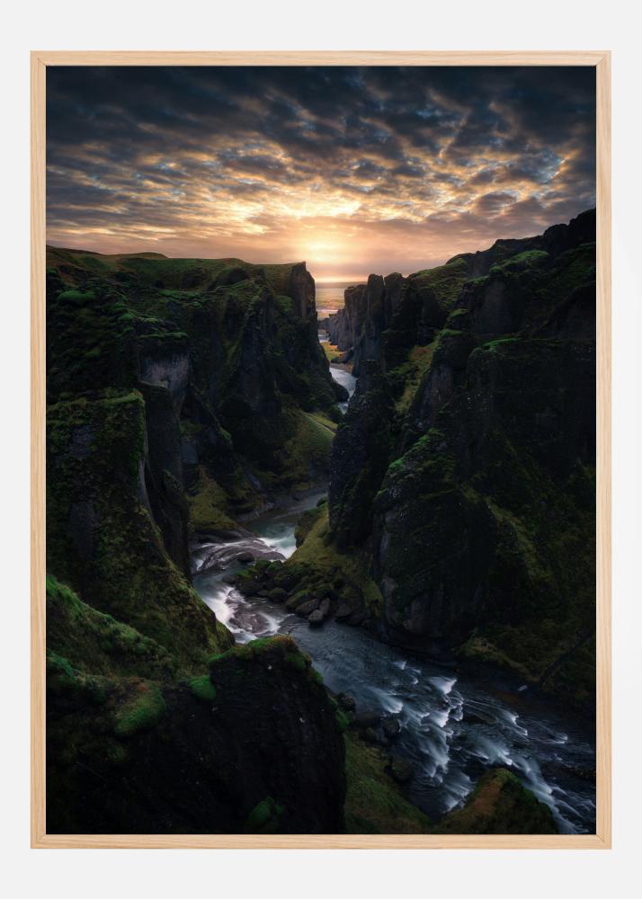 Un fantástico póster de paisaje con el Gran Cañón tomado al atardecer. Mientras que los tonos oscuros de verde crean una sensación de frío, el hermoso cielo naranja y gris ilumina el río de rápido flujo. Sigue el río y ve a dónde te lleva.