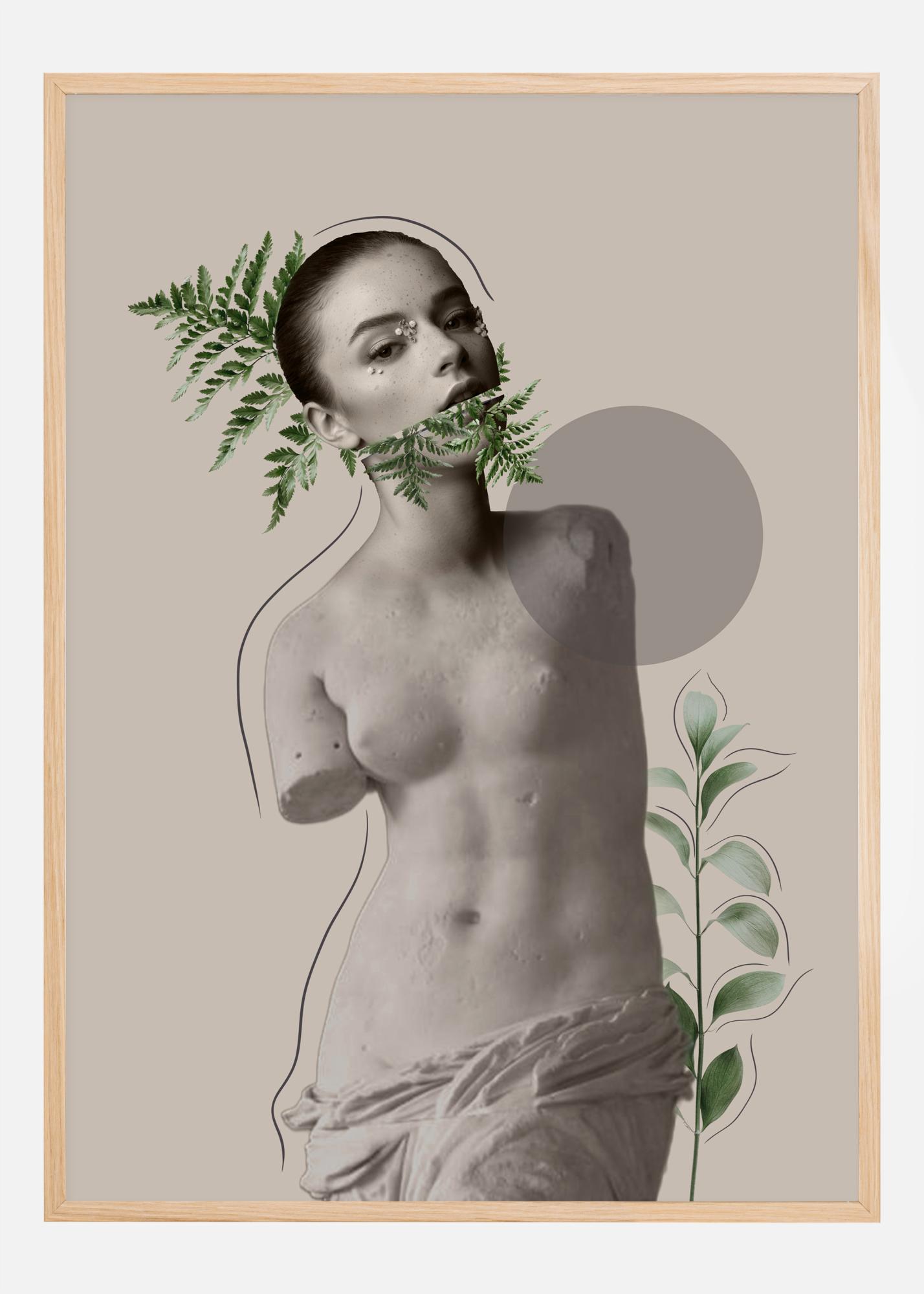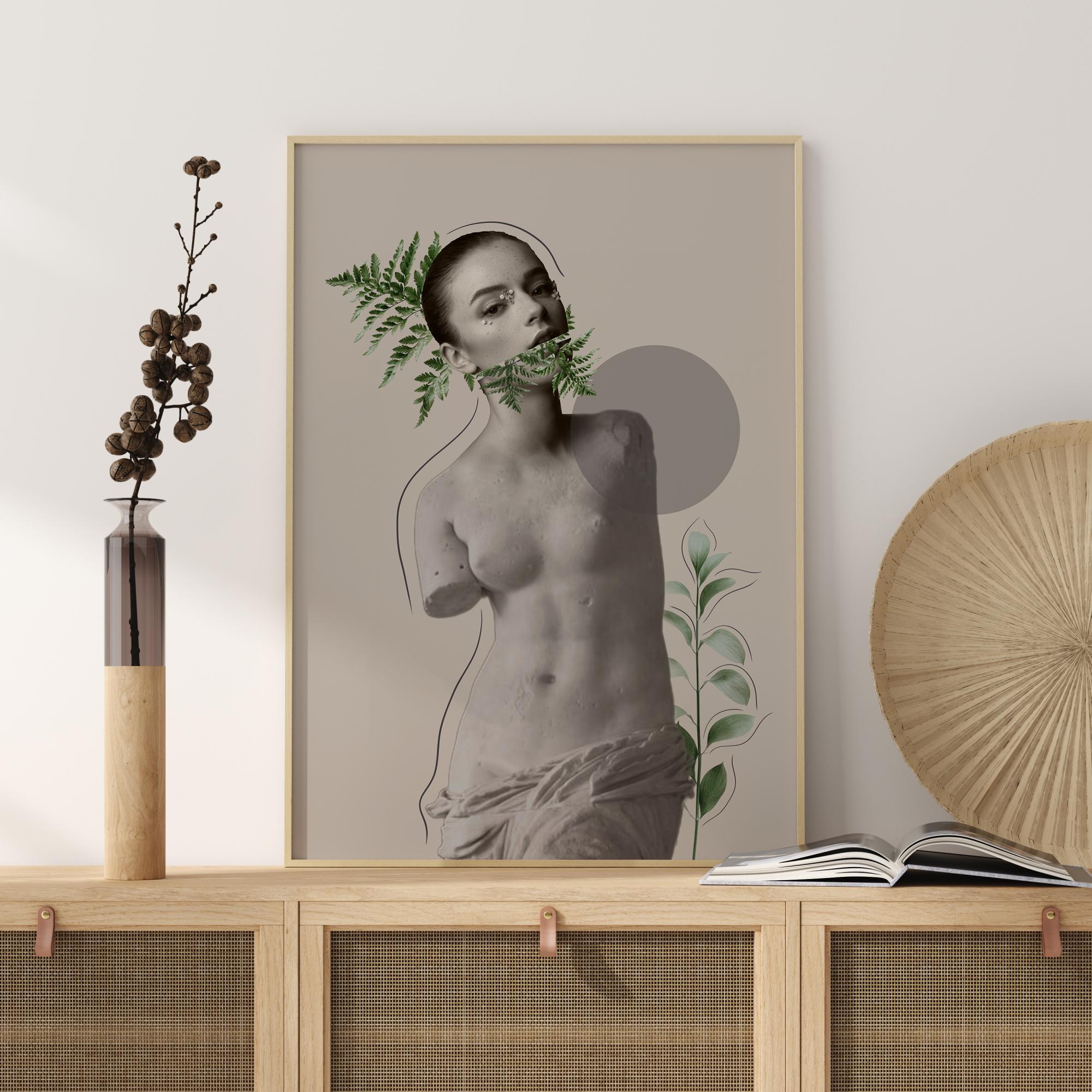 Un póster expresivo que resalta la belleza del collage. La protagonista es una hermosa mujer rodeada de vegetación en una antigua estatua griega. Un contraste delicado entre lo moderno y lo antiguo. Esta imagen es una expresión fuerte para una sala de estar minimalista.