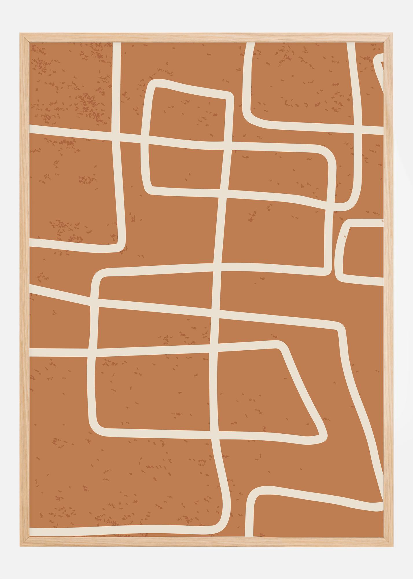 Este cartel minimalista y elegante presenta una red de líneas limpias que forman una especie de mapa abstracto o un paisaje cubista. Las líneas beige atraviesan un fondo de color terracota cálido y crean una sensación de orden y estructura sobre un lienzo texturizado suavemente. Esta es una impresión que encaja perfectamente para aquellos que aprecian el diseño moderno y el espectro de colores cálidos en su hogar u oficina.