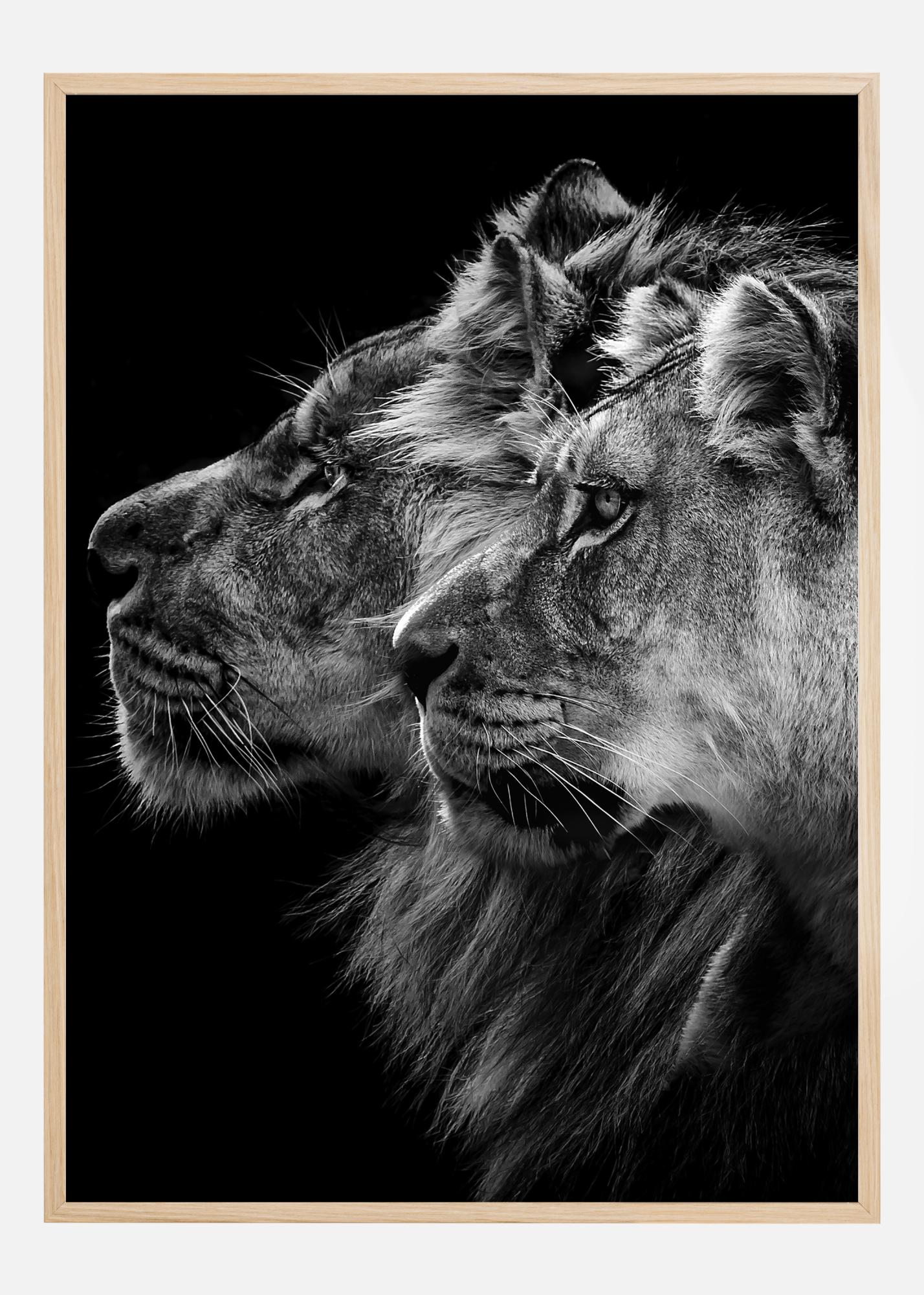 Una impresión en blanco y negro cautivadora de un león y una leona. Contra el fondo negro, estas magníficas criaturas tienen una expresión de concentración. La luz natural ilumina las líneas de las mandíbulas de los animales, lo que los hace parecer aún más dominantes. Un póster perfecto para todos los amantes de los animales.