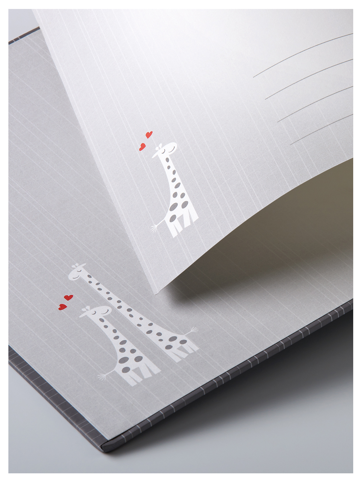Este álbum encuadernado tiene una portada gris blanquecina con estampado de jirafa. La primera página también está decorada con lindas jirafas y tiene espacio para texto.