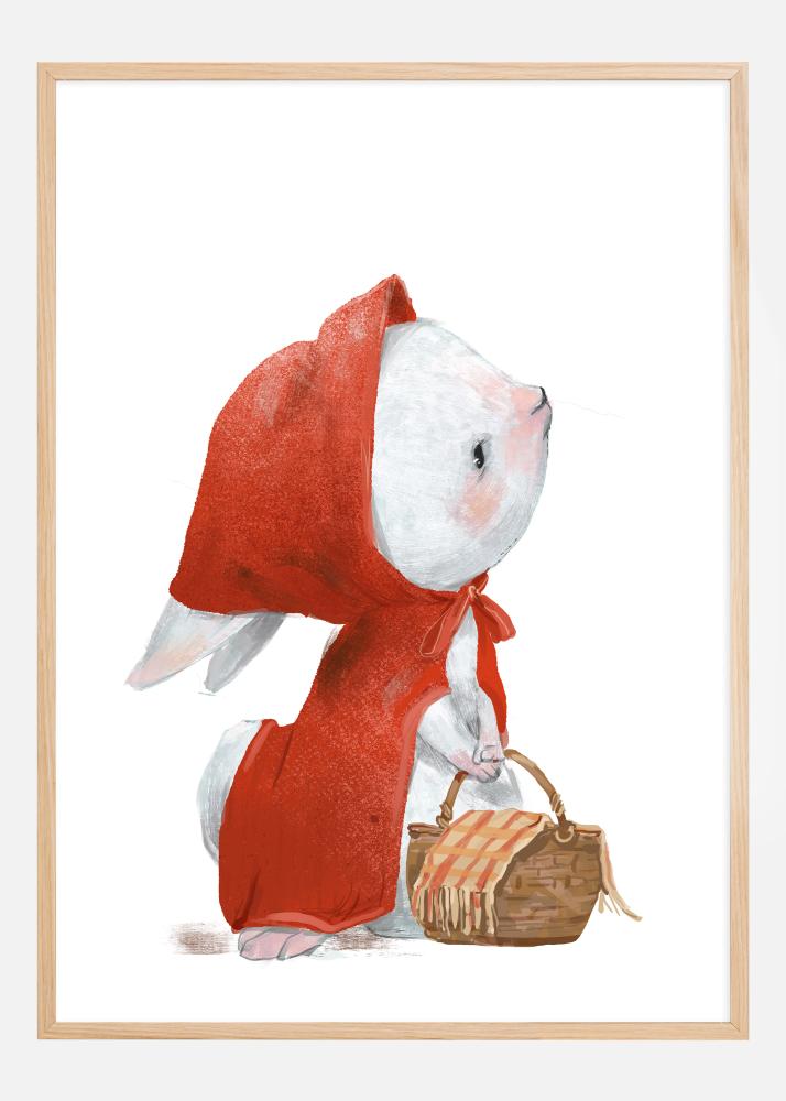Este encantador póster representa una nueva interpretación del clásico cuento de Caperucita Roja, con un dulce conejito como protagonista. El conejito está vestido con una capucha roja brillante y lleva una cesta, lo que da un guiño amistoso al famoso relato. La técnica de acuarela añade un elemento suave y de ensueño a la imagen, y las suaves pinceladas resaltan la inocencia del conejo y el carácter juguetón de la ilustración.