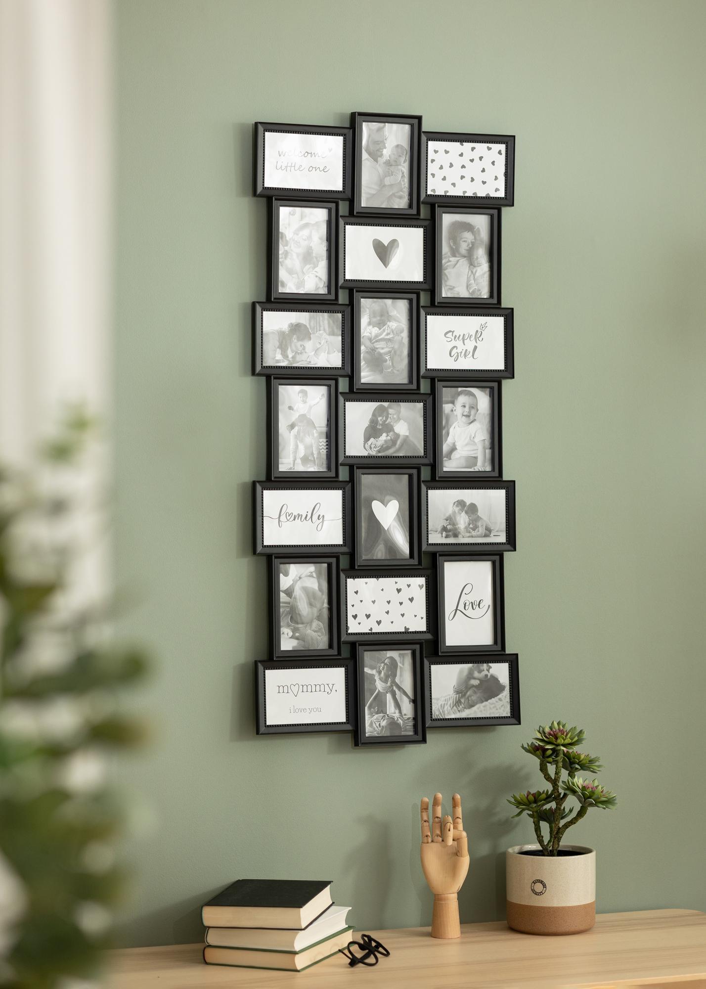 ¿Tienes una gran familia con muchas fotos que quieres colgar en la pared? Entonces este marco collage es una buena elección, ¡ya que puede contener hasta 21 fotografías! El marco es adecuado para fotos de 10x15 cm y combina imágenes tanto en posición vertical como horizontal. Los diferentes formatos están colocados simétricamente, lo que le da una apariencia muy elegante. Puedes elegir si quieres montar el marco en posición vertical u horizontal.