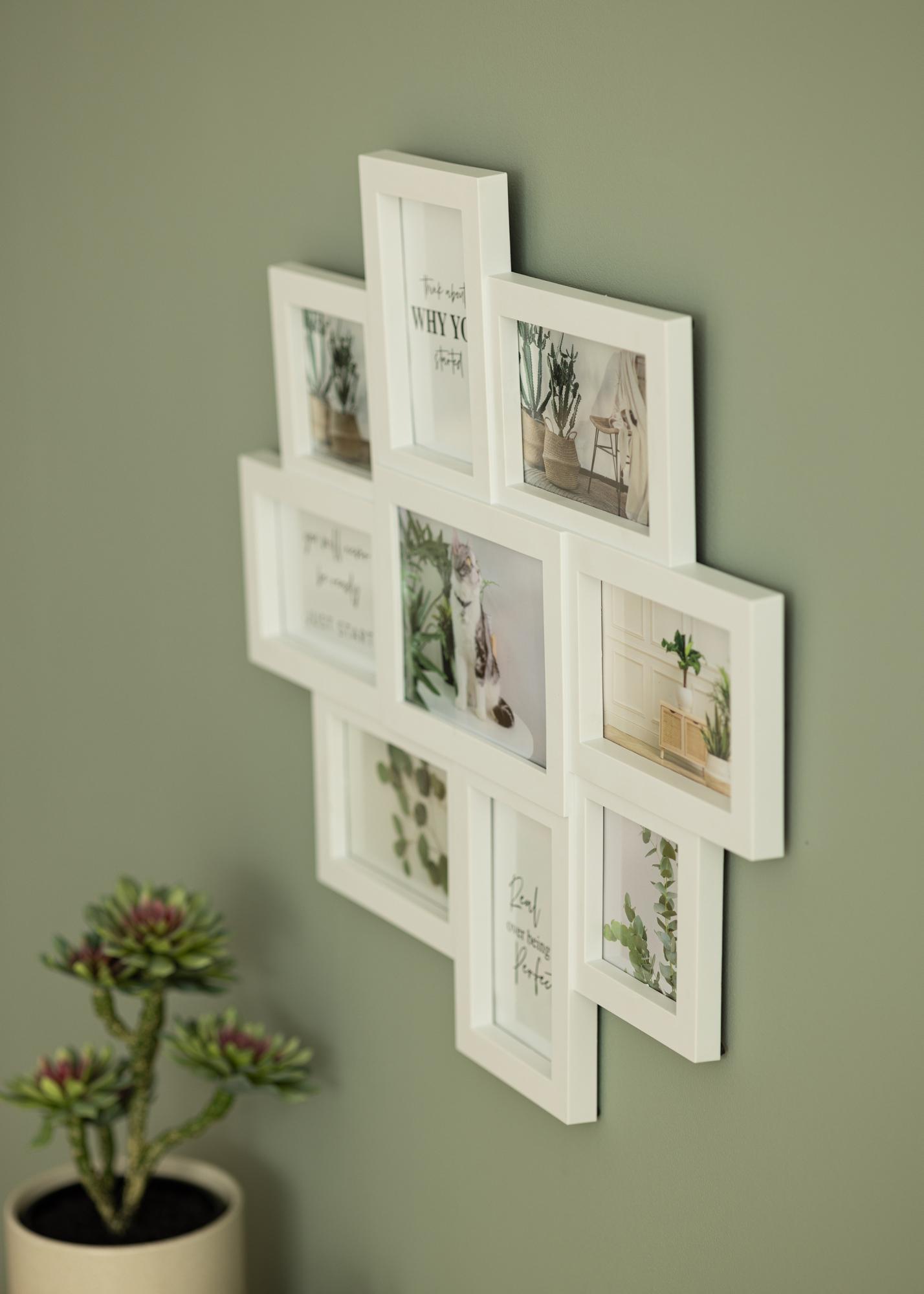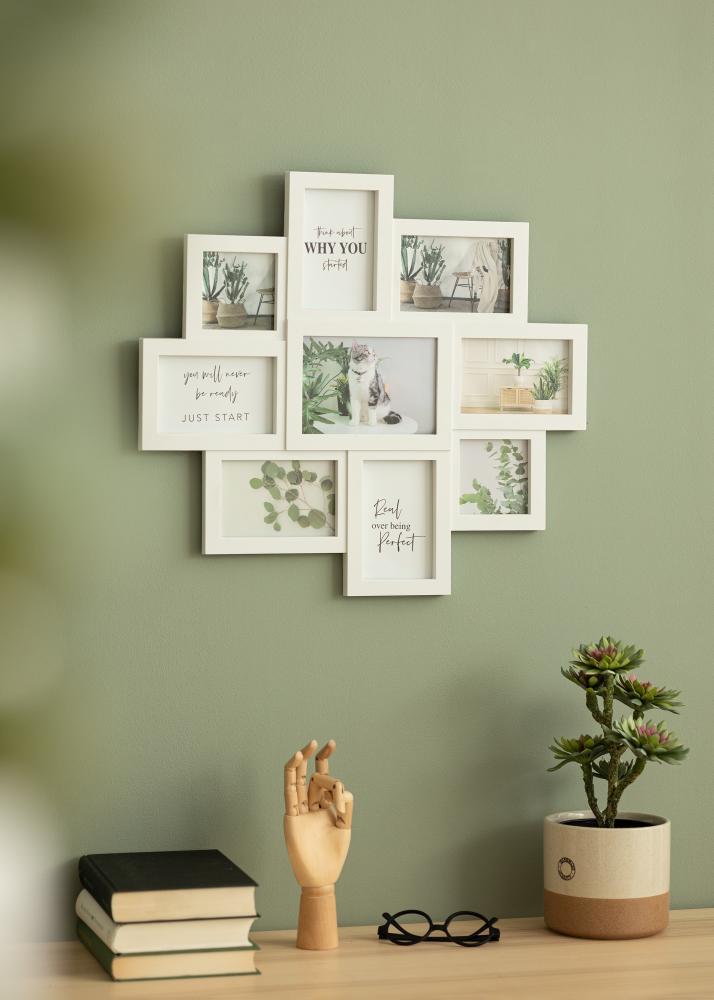 El marco está hecho de material compuesto y tiene un sofisticado tono blanco. El color neutral hace que el marco sea un complemento excelente para fotos de diferentes colores. Puedes elegir si quieres colgar tu marco collage en posición horizontal o vertical.
