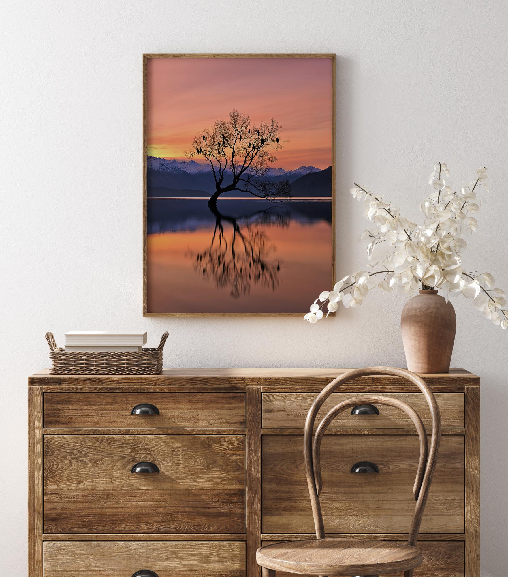 Un hermoso póster de naturaleza con un árbol solitario en medio de un lago. Con pájaros que se sientan pacíficamente en las ramas, este estampado en tonos pastel refleja el árbol en el lago y crea un efecto de espejo perfecto tanto de la naturaleza como de los colores. Escucha el silencio en esta imagen tranquilizadora.