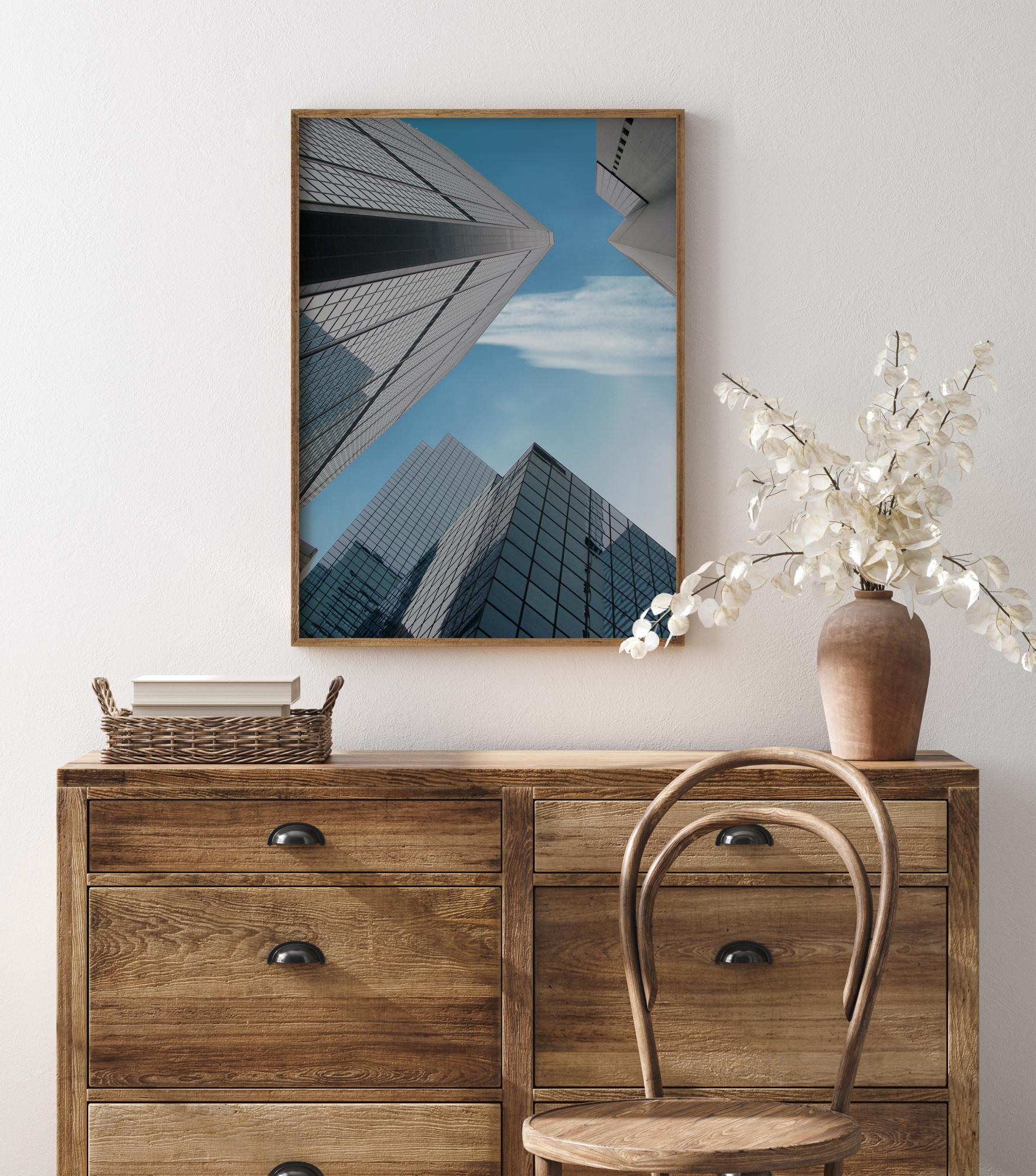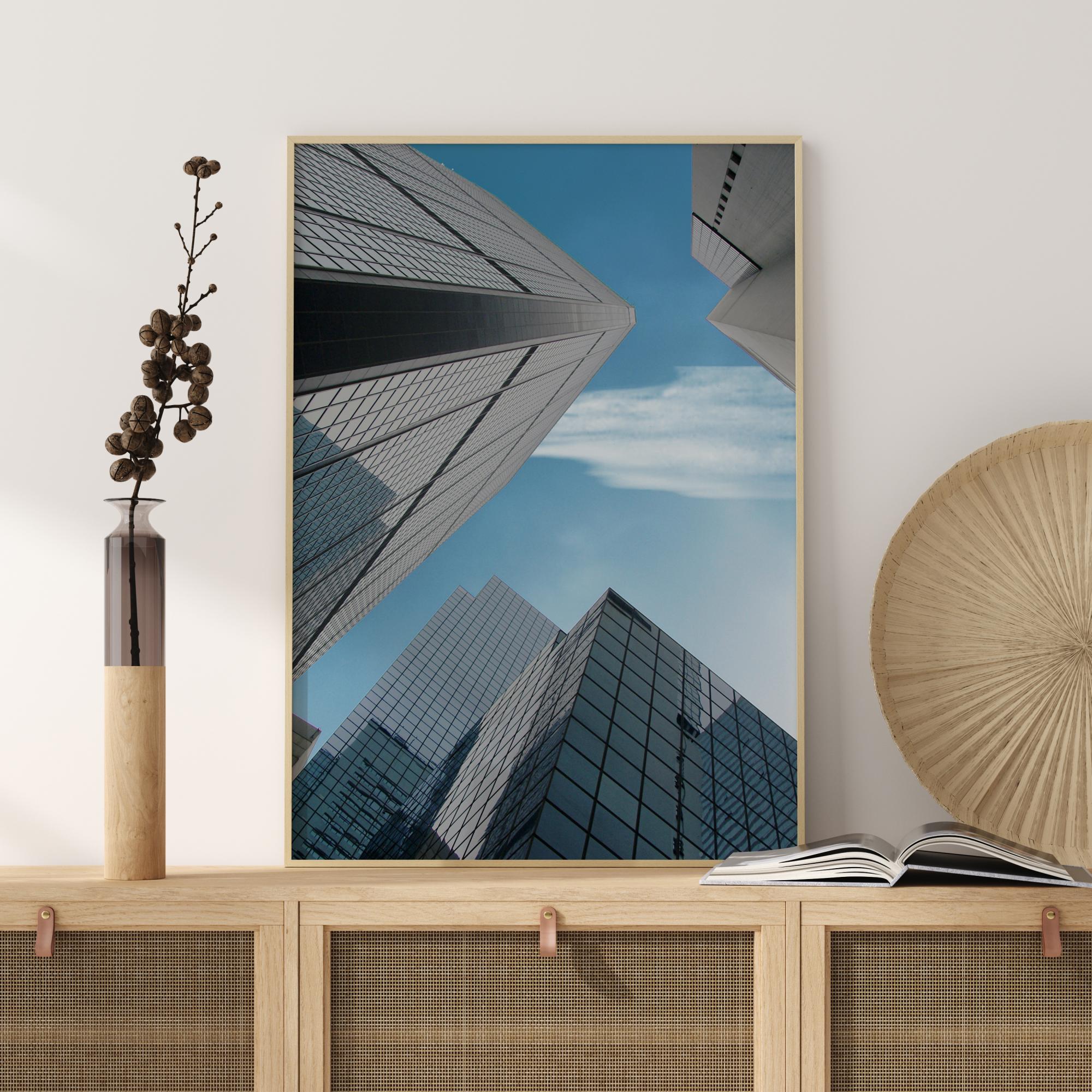 Una fascinante presión arquitectónica de edificios con ventanas espejadas. Tomada desde una perspectiva de rana, este póster brinda una sensación de grandeza. El hermoso cielo azul claro con una sola nube blanca le da a esta hermosa imagen un toque extra de color. Perfecto en un espacio más pequeño para brindar una sensación de infinitud en una habitación pequeña.