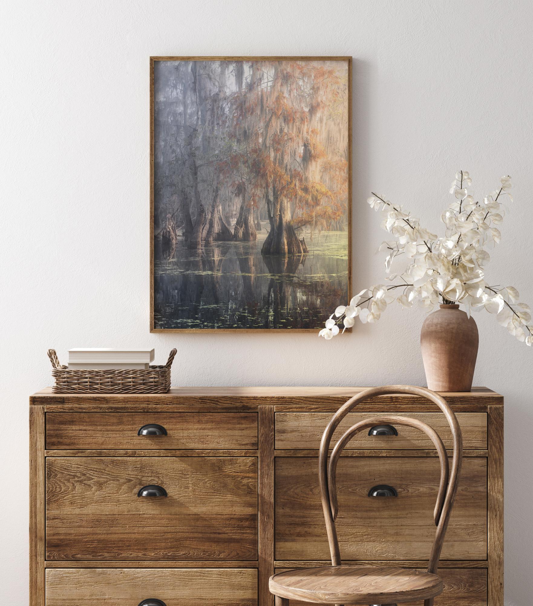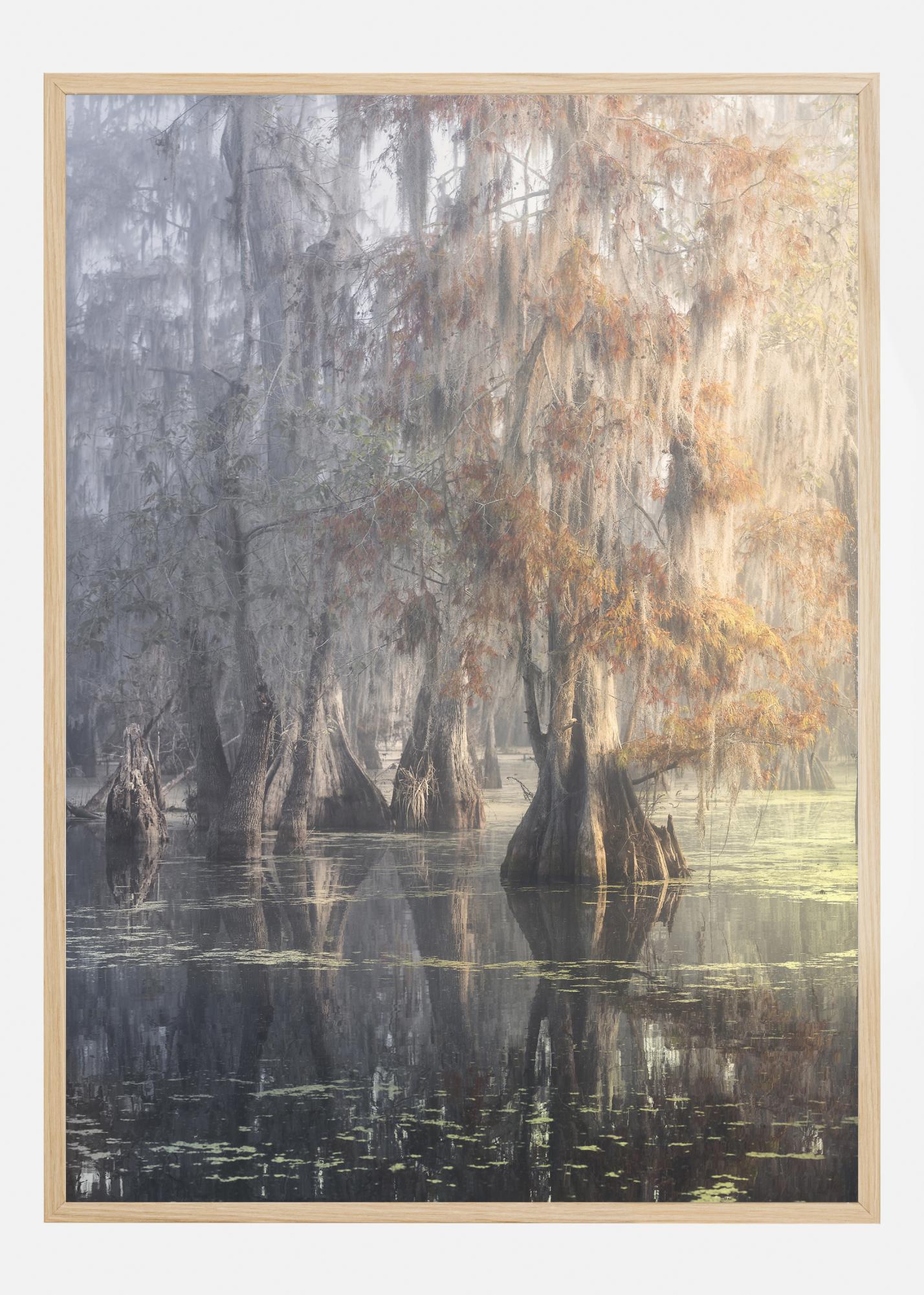 Un póster fascinantemente hermoso con un pantano en Louisiana. Una imagen apacible de un pantano con agua quieta. La luz natural crea reflejos perfectos en el pantano y crea una sensación de calma. Trae la naturaleza a tu hogar con los hermosos tonos verdes y marrones de esta impresión.