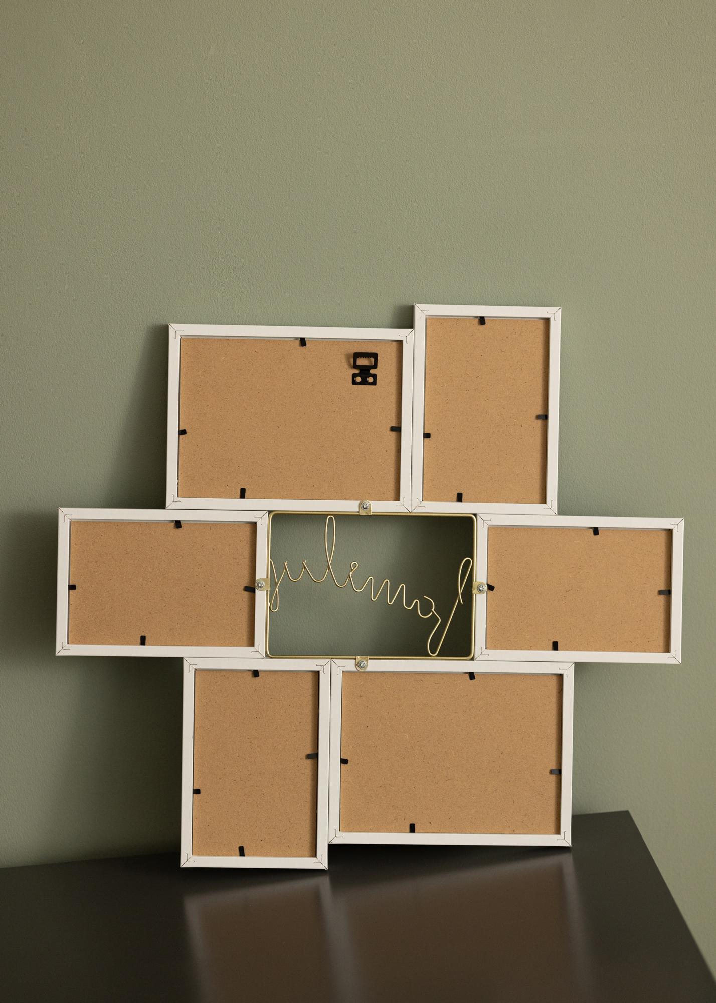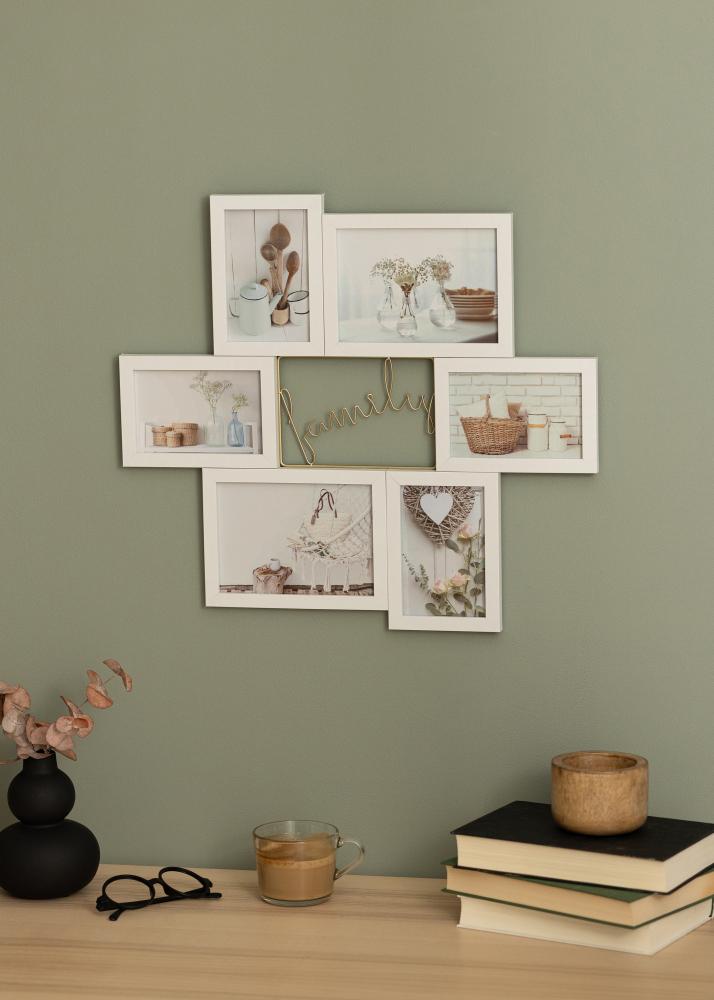 Este marco collage blanco es la elección perfecta para aquellos que tienen hermosas fotos familiares que deseasn colgar en la pared. El marco está hecho de madera y tiene espacio para un total de 6 fotos en formato vertical y horizontal. Es adecuado para 4 fotos de tamaño 10x15 cm y 2 de 13x18 cm. Las fotos se colocan en pequeños marcos alrededor del texto "family", que está escrito con alambre de metal dorado.