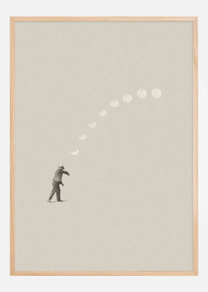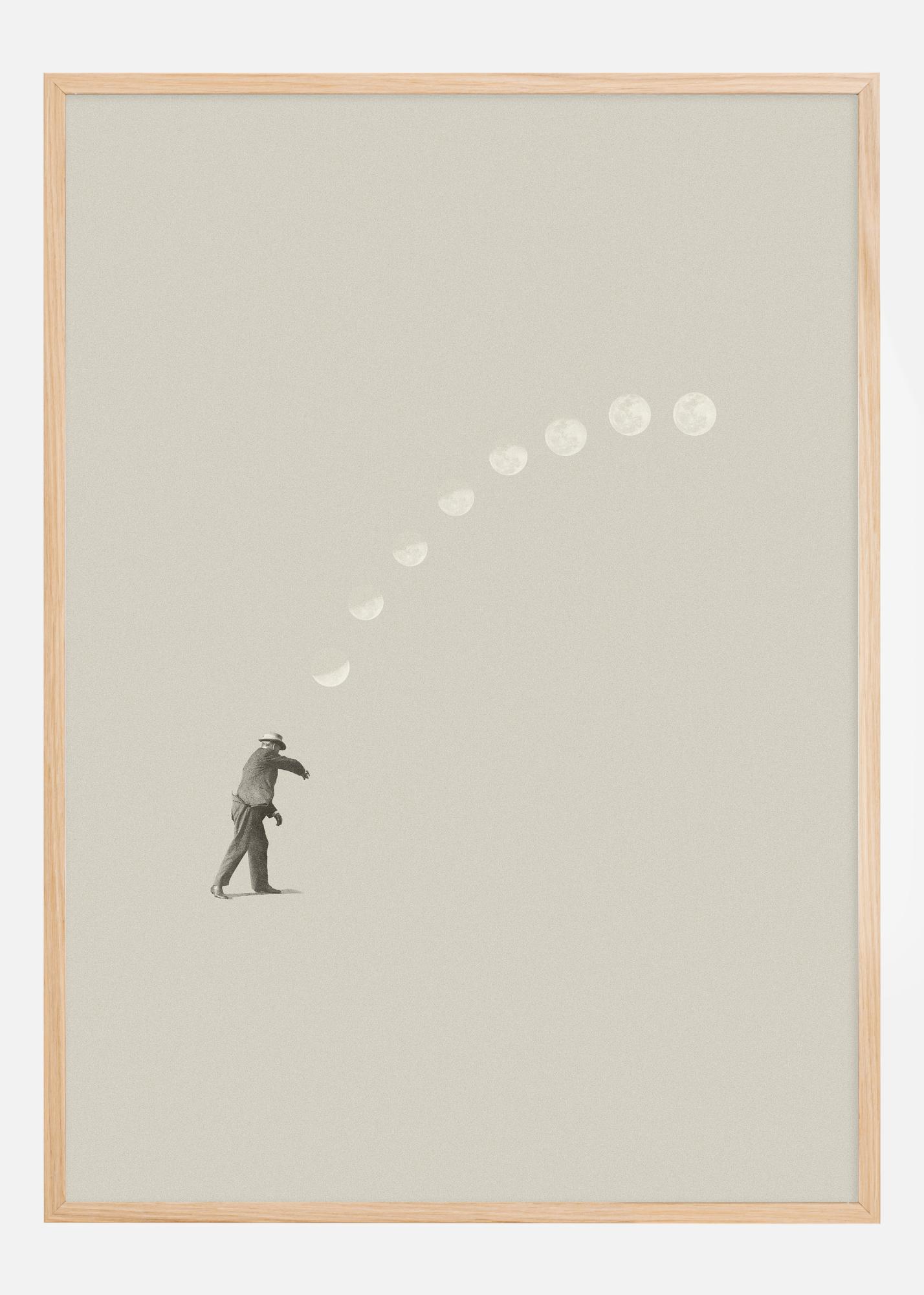 Este póster poético retrata la silueta de un hombre que, con un movimiento poderoso, lanza una luna hacia el cielo. Es una escena que captura el momento de una luna siendo elegantemente enviada y formando una órbita de diferentes fases lunares. Esta acción simboliza posiblemente sueños y ambiciones que se lanzan hacia posibilidades infinitas. El minimalismo de la imagen refuerza el gesto poderoso y deja espacio al espectador para llenar su propia historia y significado.