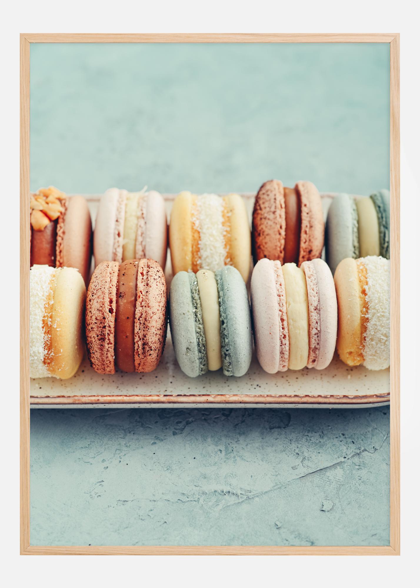 Este póster colorido y apetitoso presenta una serie de macarons delicadamente ordenados, cuyas variadas colores y texturas crean una fiesta visual. Los suaves colores pastel varían desde un limón pálido hasta un rico caramelo y un rosa empolvado, cada macaron está acentuado con detalles como chispas y escamas de coco, lo que realza su apariencia y su supuesto sabor.