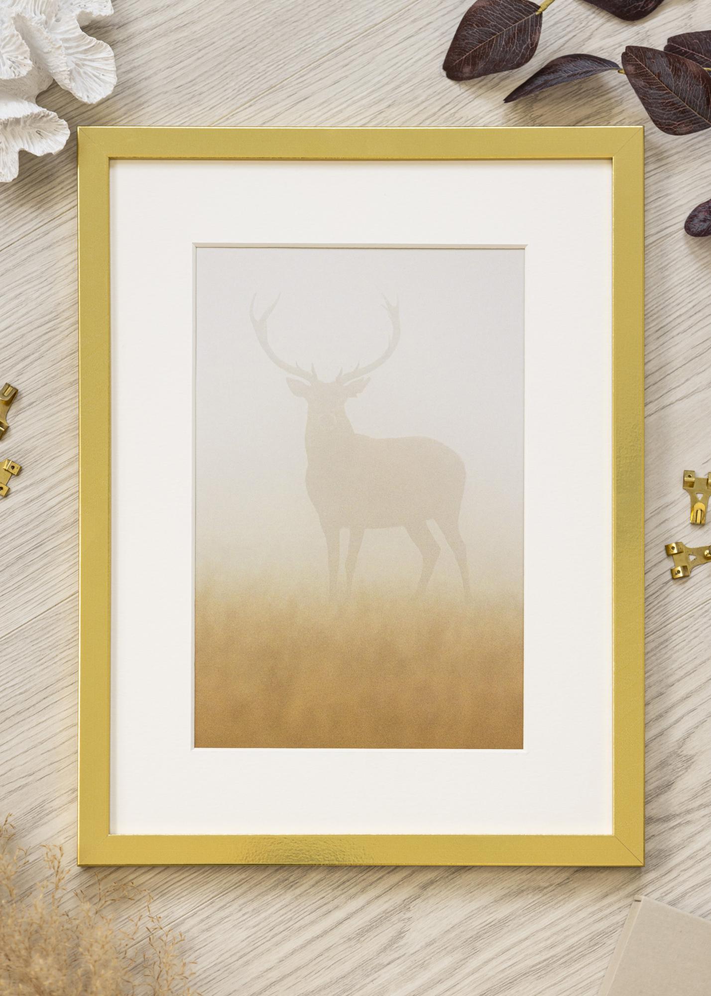 Este marco de fotos dorado es una combinación perfecta de elegancia y diseño moderno. Con un perfil elegante y un tono dorado lujoso, proporciona una expresión sofisticada a cualquier habitación. El marco está hecho de madera y tiene un brillo sutil con un acabado ligeramente texturizado, lo que refuerza su sensación exclusiva. Las esquinas afiladas y limpias contribuyen a su apariencia minimalista, lo que lo hace ideal para resaltar tus motivos favoritos.