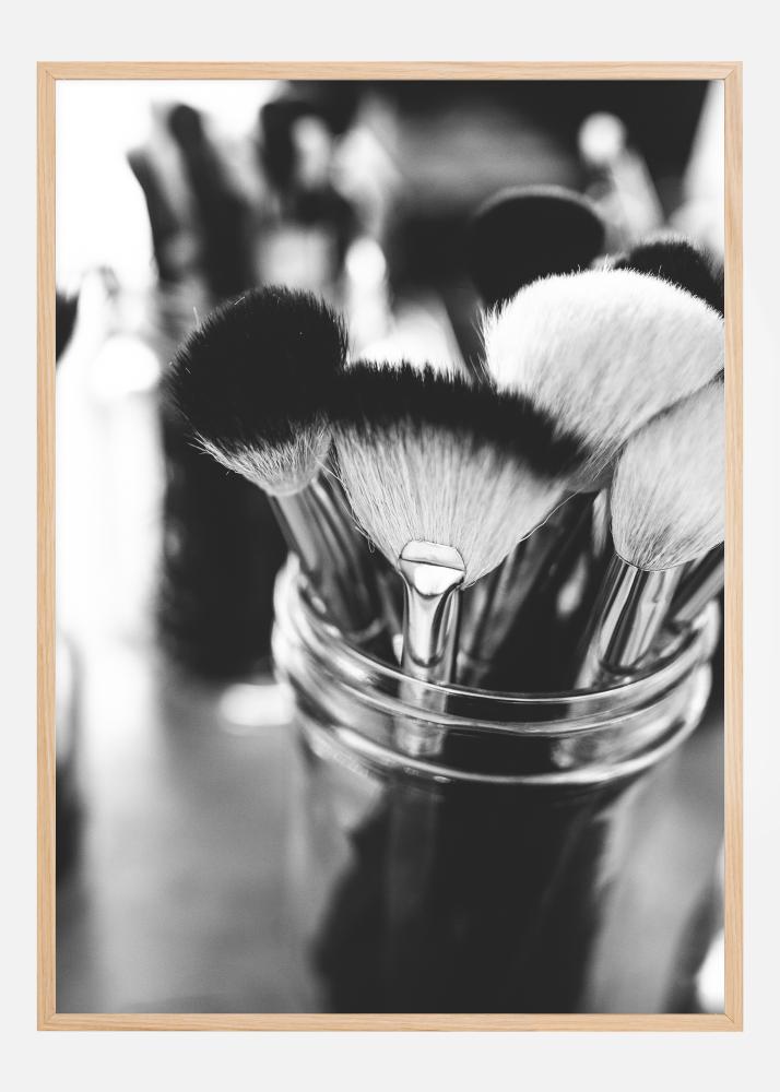 Una divertida pero artística impresión de un frasco de vidrio lleno de pinceles para tocador. Este llamativo póster en blanco y negro muestra varios pinceles de diferentes tamaños. Siente lo suaves que son estos pinceles cuando cuelgues esta impresión en la pared de tu dormitorio.