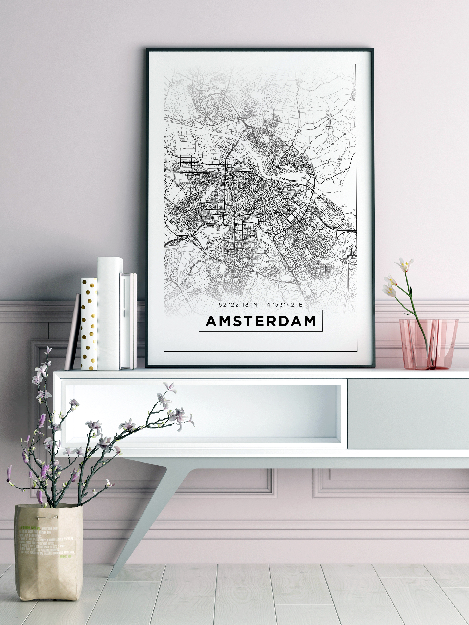 Presentamos aquí un póster de mapa muy elegante de la ciudad de Ámsterdam en blanco y negro. Aquí vemos todas las calles de la ciudad extendiéndose, para luego desvanecerse y enmarcarse con una línea negra redonda en el norte y el sur. En la parte inferior del mapa, se encuentra impreso "Ámsterdam" en letras mayúsculas negras, con las coordenadas de la ciudad encima; Ámsterdam enmarcado en el mismo estilo que el mapa de la ciudad en sí. La imagen está rodeada por un amplio margen blanco que crea espacio y al mismo tiempo ayuda a dirigir la mirada hacia el contenido del cuadro. Un póster de mapa elegante y moderno de Ámsterdam que se adapta a todas las habitaciones del hogar. ¡aporta un marco elegante y tendrás el detalle de decoración perfecto!