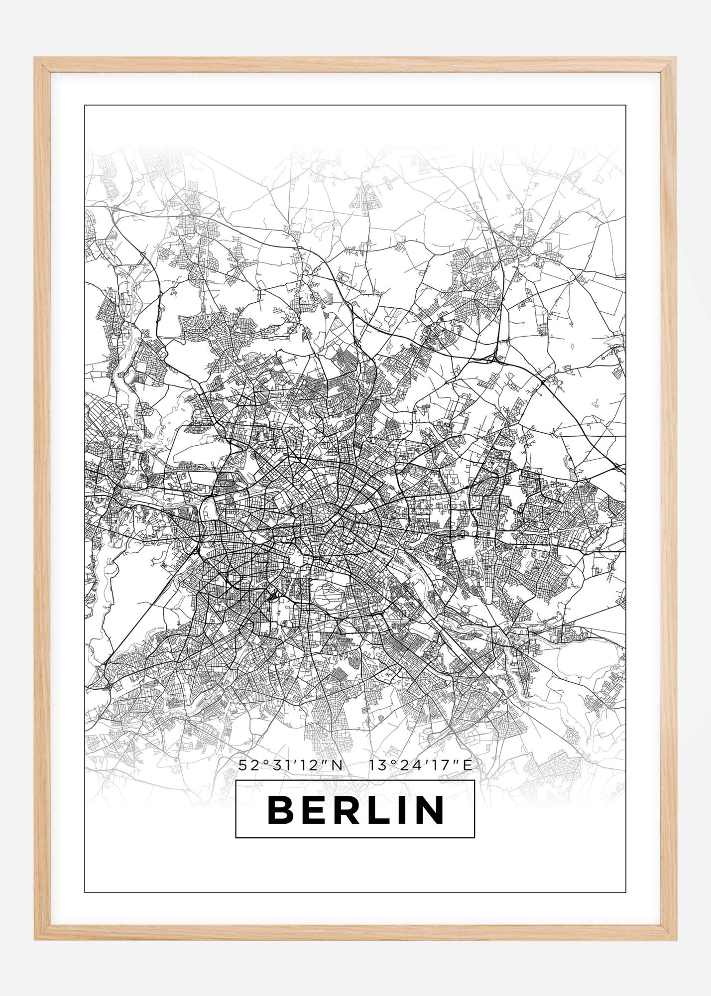 Aquí vemos el corazón de Alemania expandirse como una flor en blanco y negro. Un póster en formato vertical que muestra toda la red de carreteras de Berlín enmarcando todas las calles y plazas de la ciudad. En la parte superior e inferior de la imagen, todas las líneas negras del mapa de la ciudad se desvanecen en blanco y están rodeadas por un fino marco negro. En la parte inferior de la imagen del mapa, "Berlín" está impreso en letras grandes y encima de ello, las coordenadas de la ciudad; Berlín enmarcado como el propio mapa de la ciudad. El motivo está rodeado por un margen blanco un poco más ancho que de manera elegante captura la atención hacia su contenido. ¡Un póster de mapa elegante y minimalista que fácilmente adorna cualquier pared!