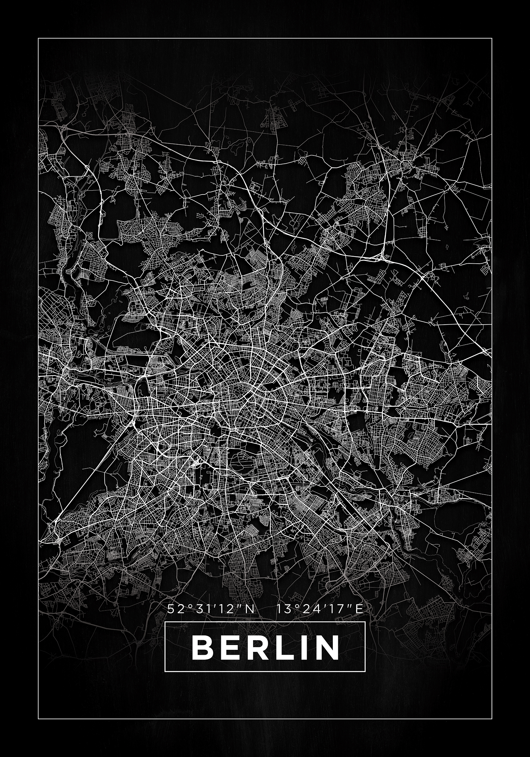 Si buscas un homenaje a Berlín, ¡esta es la opción perfecta! Con calles y plazas en blanco sobre un fondo negro, el mapa de la ciudad se convierte en el punto focal perfecto. En la parte inferior de la imagen se encuentran las coordenadas de la ciudad impresas, justo encima del nombre de la ciudad escrito en letras grandes. Berlín, tanto el nombre como el mapa, está elegantemente enmarcado con una fina línea blanca. El mapa de la ciudad está rodeado por un amplio margen negro que crea un espacio aéreo elegante entre el marco y el contenido del póster. ¡Un póster de mapa poderoso y elegante que funciona como el detalle de decoración perfecto!