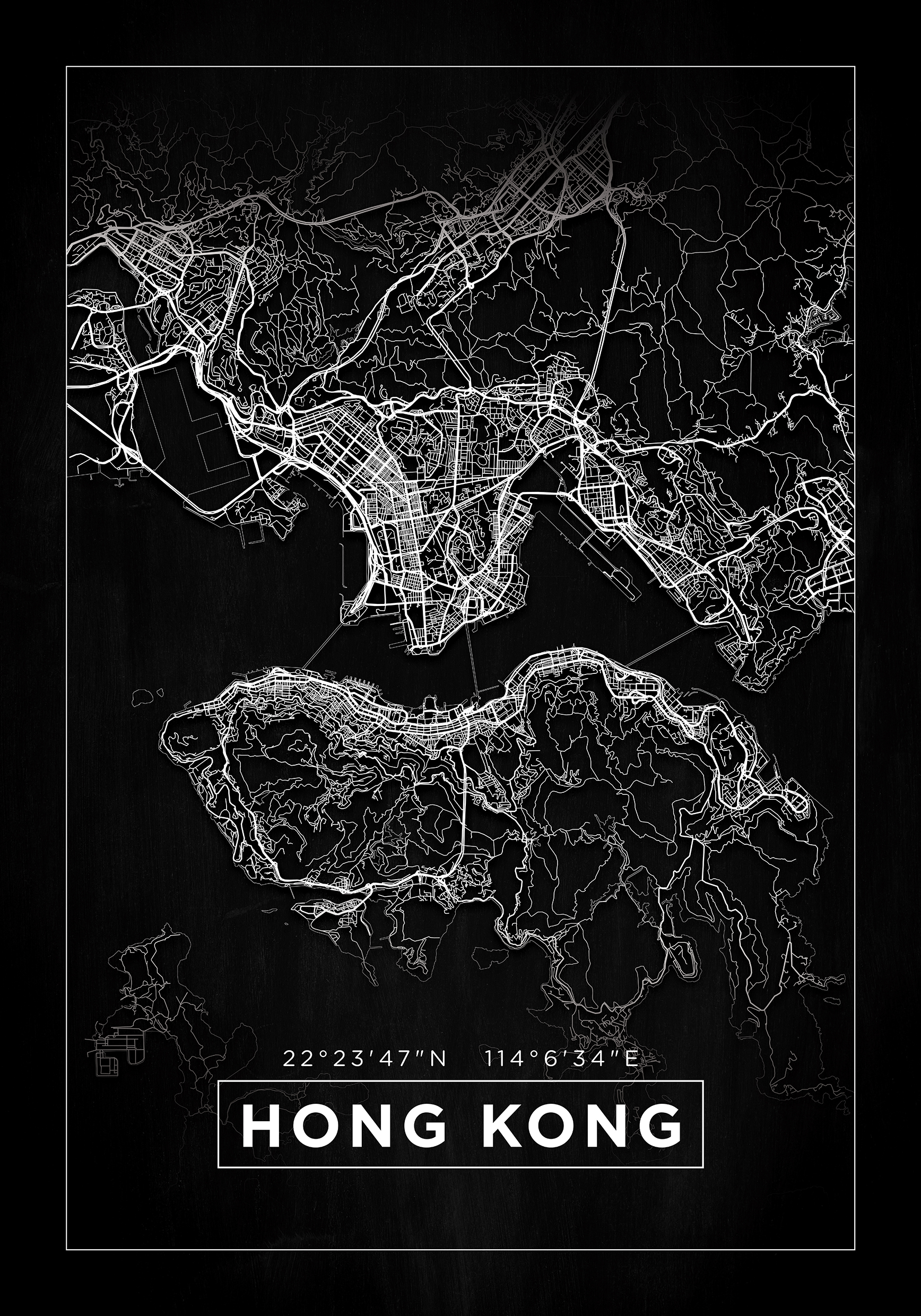 Aquí tenemos un mapa de la ciudad de Hong Kong que puede ser el regalo perfecto para ti mismo o para alguien que lleve la ciudad especialmente cerca de su corazón. Las calles y plazas están estampadas en blanco sobre el fondo negro. En el norte y el sur, el mapa se desvanece y en la parte inferior de la imagen se encuentra Hong Kong enmarcado en letras blancas. Encima del marco del nombre se encuentran los números que indican las coordenadas geográficas de la ubicación de la ciudad. El mapa está rodeado por un marco igual que el nombre de la ciudad y fuera de él hay un margen negro más amplio que ayuda de manera efectiva a captar y dirigir la mirada hacia el contenido del cuadro. ¡Un póster de mapa muy elegante que realmente llama la atención!