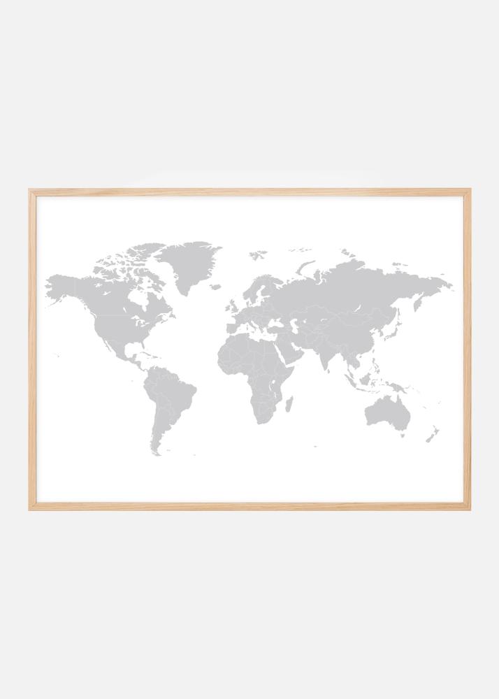Impresión gráfica de un mapamundi en un agradable color gris que es perfecto para colgar junto con otros pósters en una galería de pared. La impresión elegante se adapta a todo tipo de entornos, tanto en entornos públicos como en el hogar. Con la elección del marco para complementar el póster, se puede adaptar a todos los estilos de decoración y esquemas de color. El póster es un regalo agradecido para aquellos que necesitan decorar las paredes.