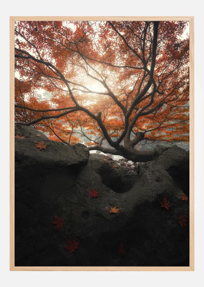 Un fascinante póster de naturaleza con un hermoso árbol de arce de color naranja. Fotografiado desde una perspectiva de rana, la luz solar intensa brilla a través de las ramas y crea una sensación cálida y relajada. En primer plano, algunas hojas rojas y naranjas han caído sobre un tronco. Añade un toque de naturaleza a tu hogar con esta impresión.