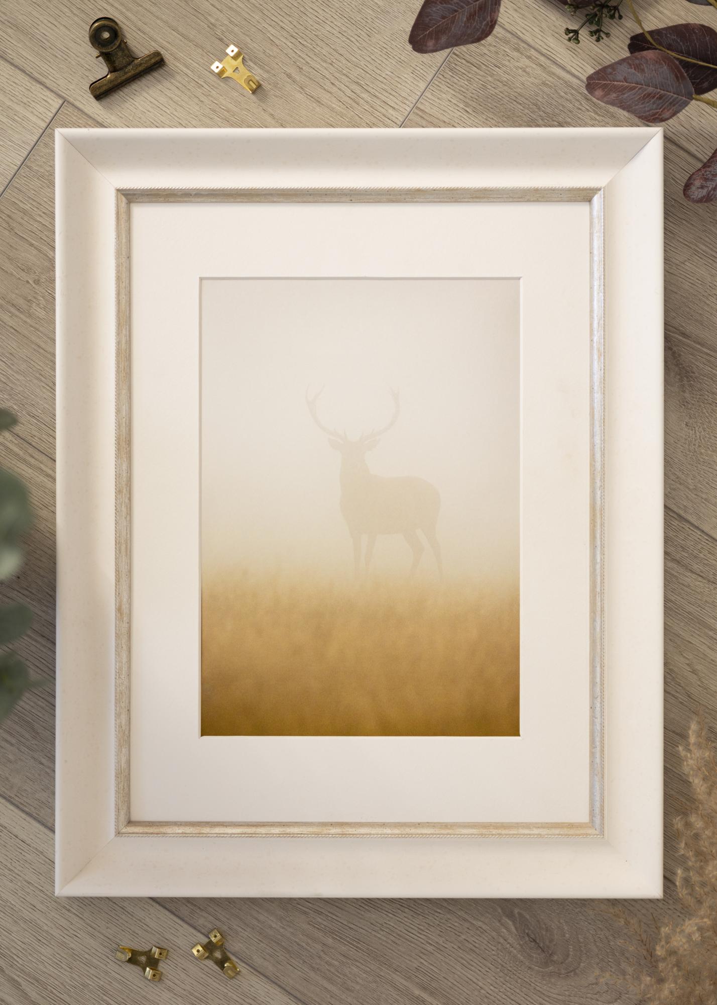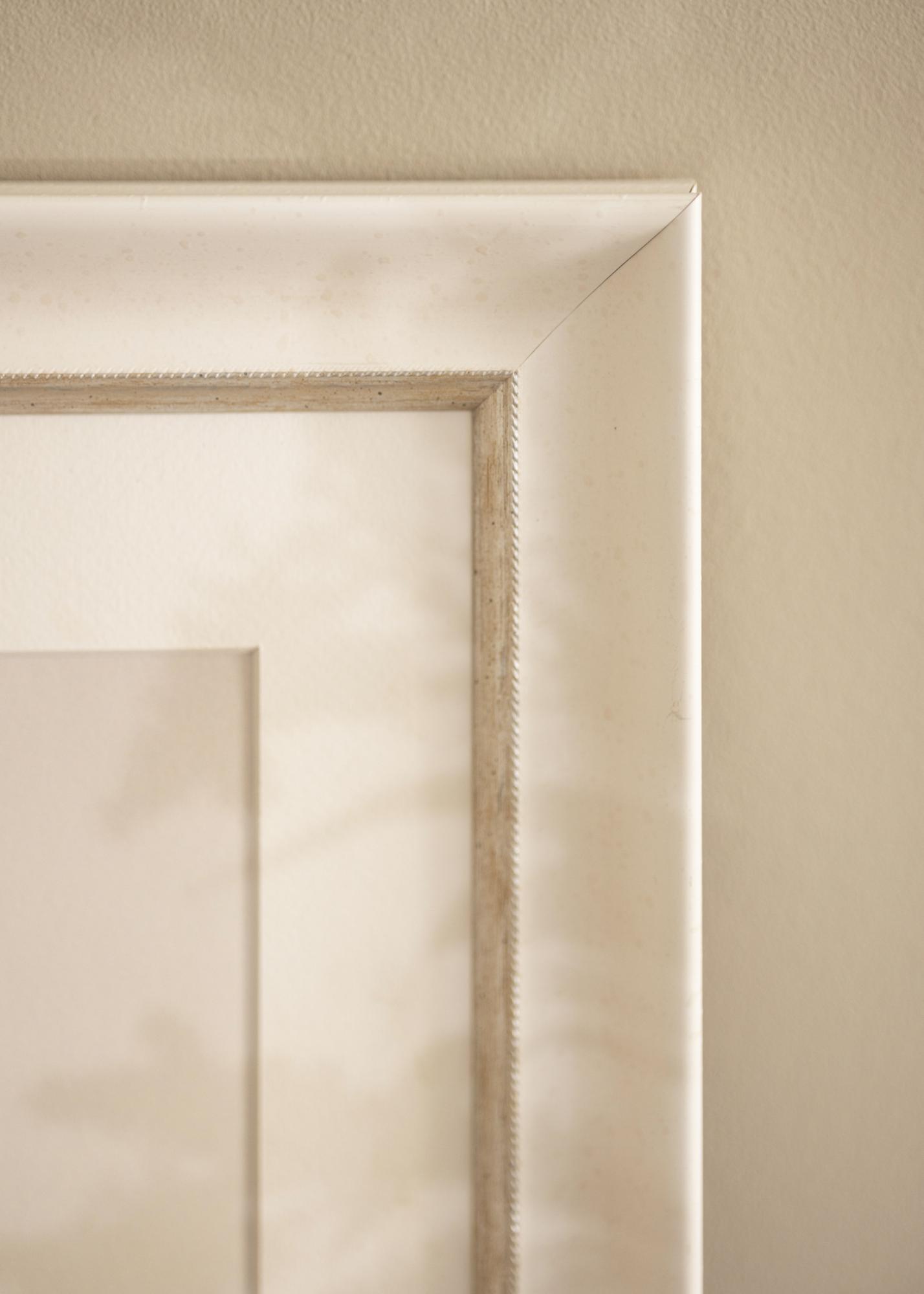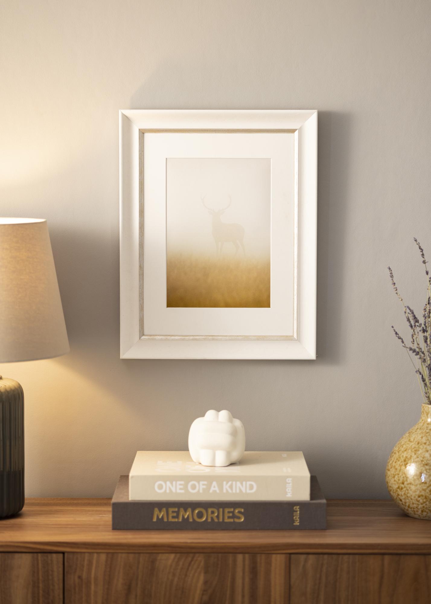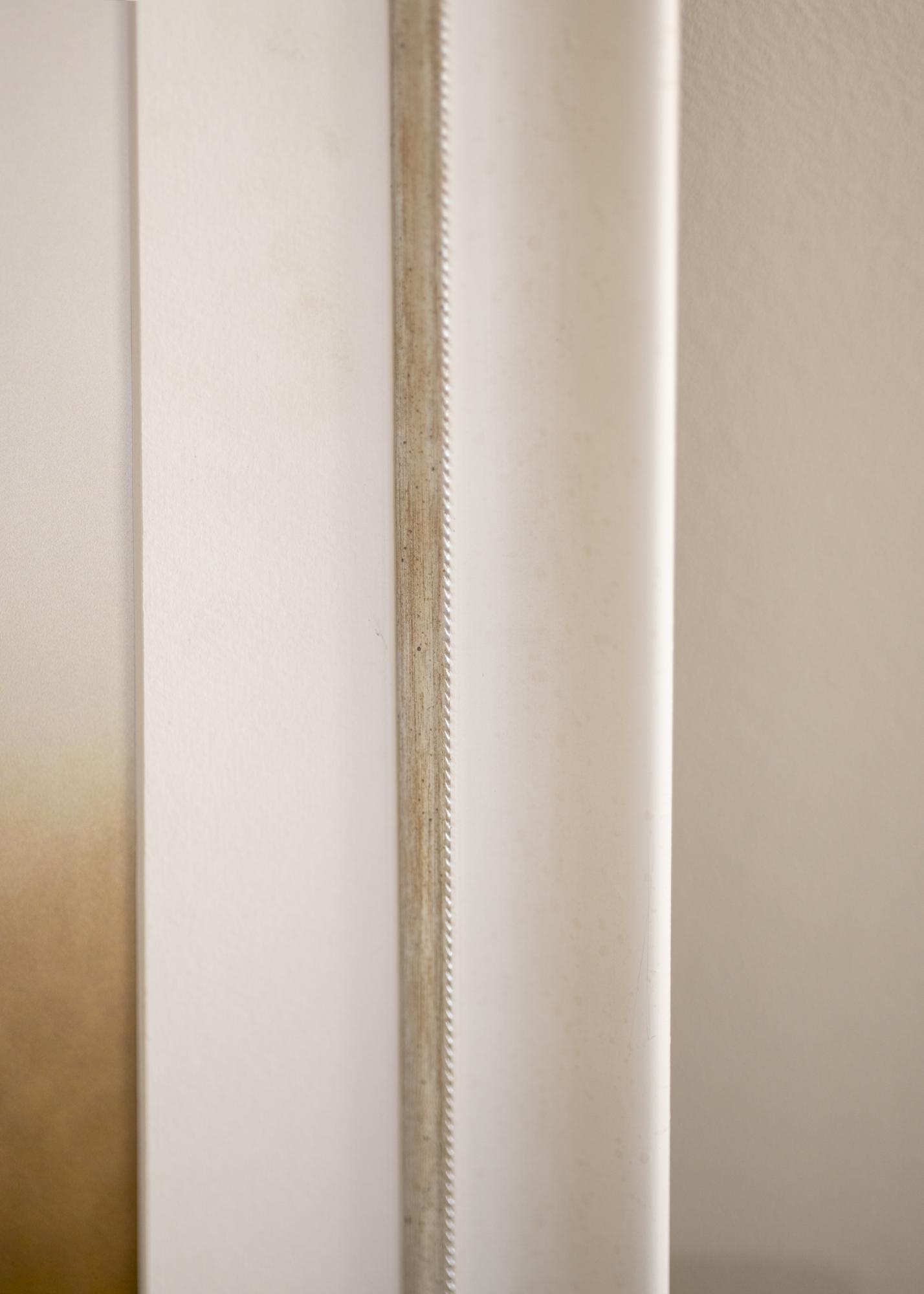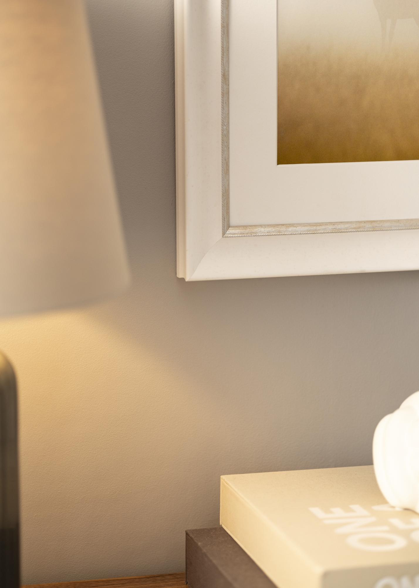 Marco sólido en cualquier tamaño con un perfil clásico blanco. Cerca de la imagen hay un elegante borde plateado que le da brillo adicional al marco.