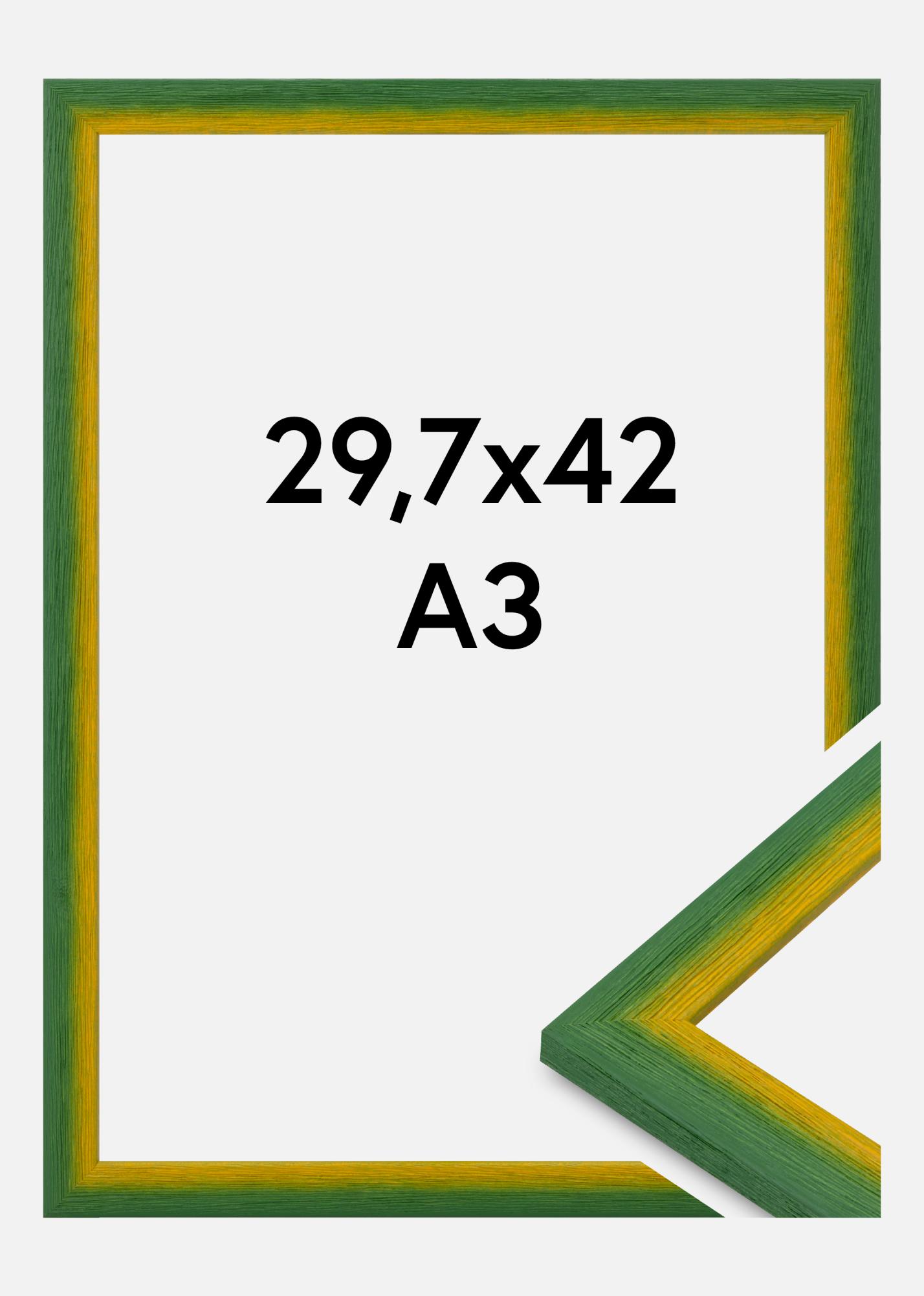 Este Marco en tamaño 29,7x42 cm es una combinación perfecta de diseño moderno y belleza natural. Con su superficie lisa y la armoniosa mezcla de tonos verdes y dorados, resalta la textura natural de la madera de forma elegante. El perfil estrecho, con una moldura de 23 mm y una profundidad de 13 mm, aporta una expresión estilizada y sencilla que permite que tu motivo sea el protagonista.