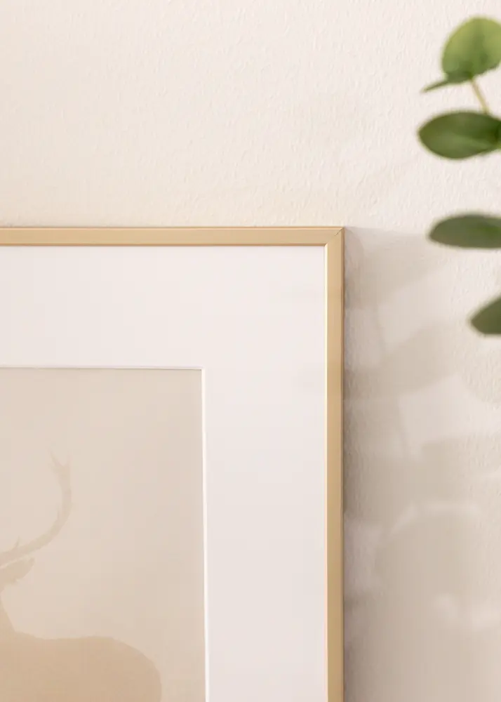 El marco tiene un perfil delgado con una moldura que mide 7,8 mm de ancho y una profundidad de 18,6 mm. Las esquinas afiladas y el acabado liso contribuyen a una sensación elegante que se adapta perfectamente a estilos de decoración modernos, escandinavos o minimalistas. El color latón claro permite que el marco se integre fácilmente en la mayoría de los hogares y funciona igual de bien para fotografías como para obras de arte.
