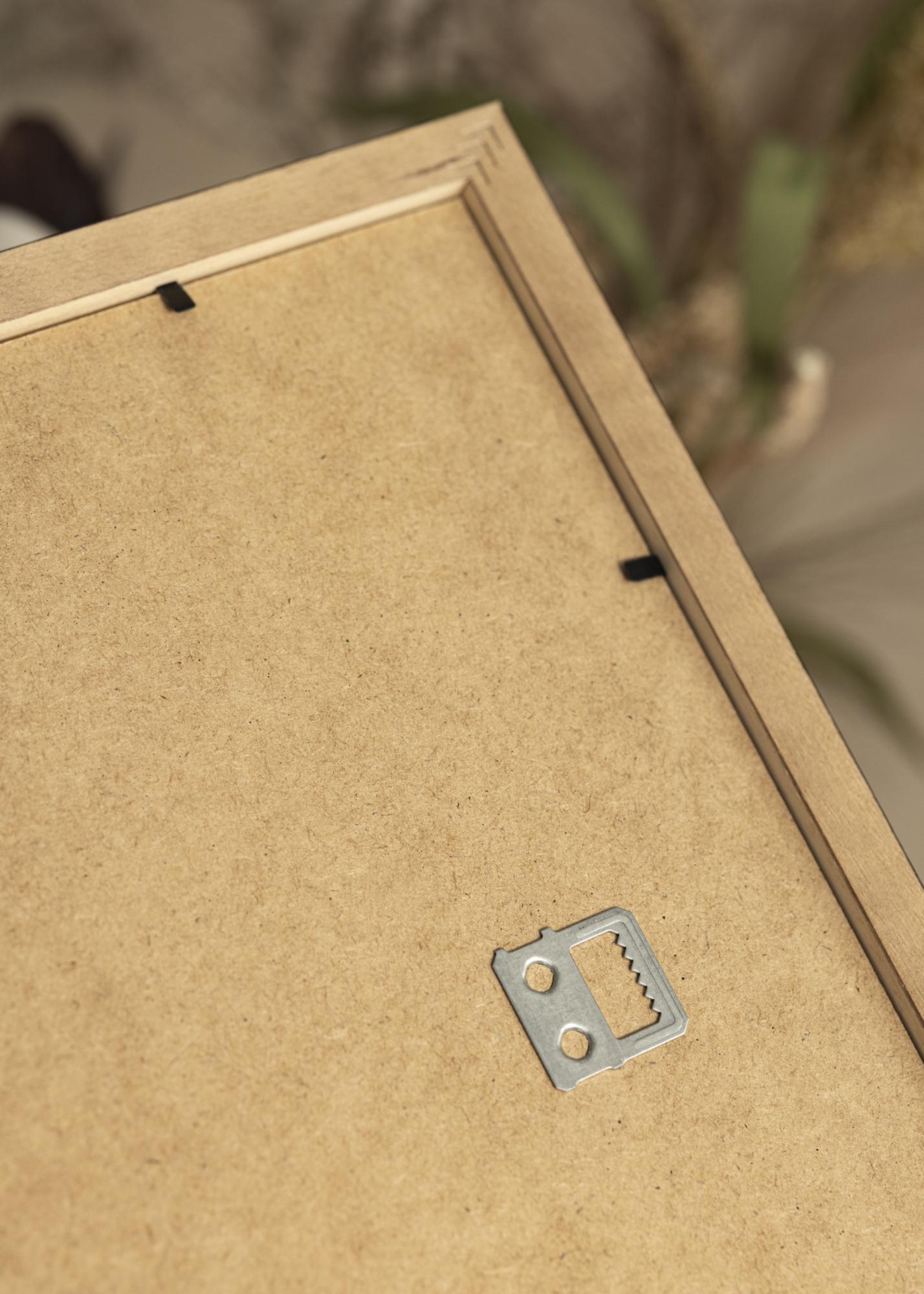 Este marco para cuadros está equipado con vidrio acrílico, que es una alternativa más resistente y ligera al vidrio común. En la parte trasera encontrarás soportes de pared para colgar horizontal y verticalmente.