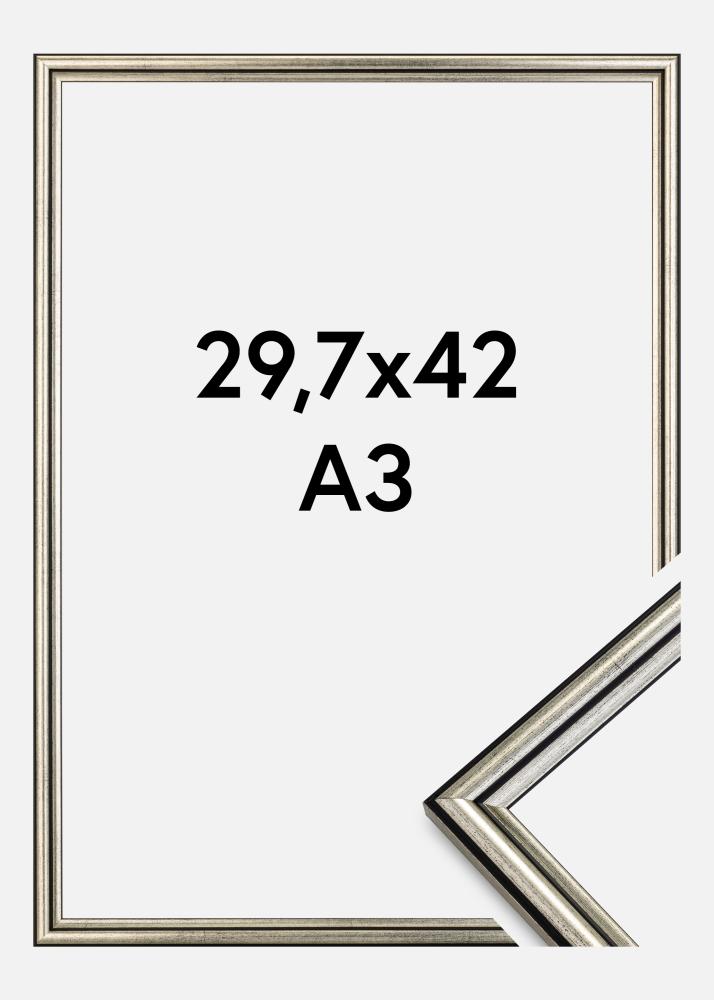 Bajo esta sección, descubre la elegancia y el diseño moderno de nuestro marco de plata de 29,7x42 cm (A3), perfecto para destacar tus obras de arte o fotografías favoritas. Este marco de fotos es una elegante combinación de tonos plateados con detalles discretos y manchas negras, y líneas negras que crean una impresión sofisticada.