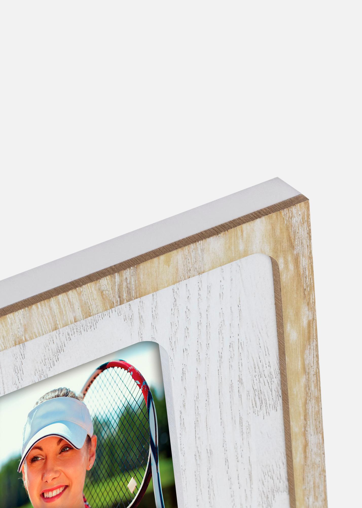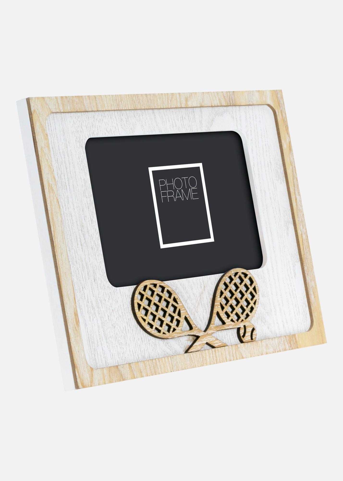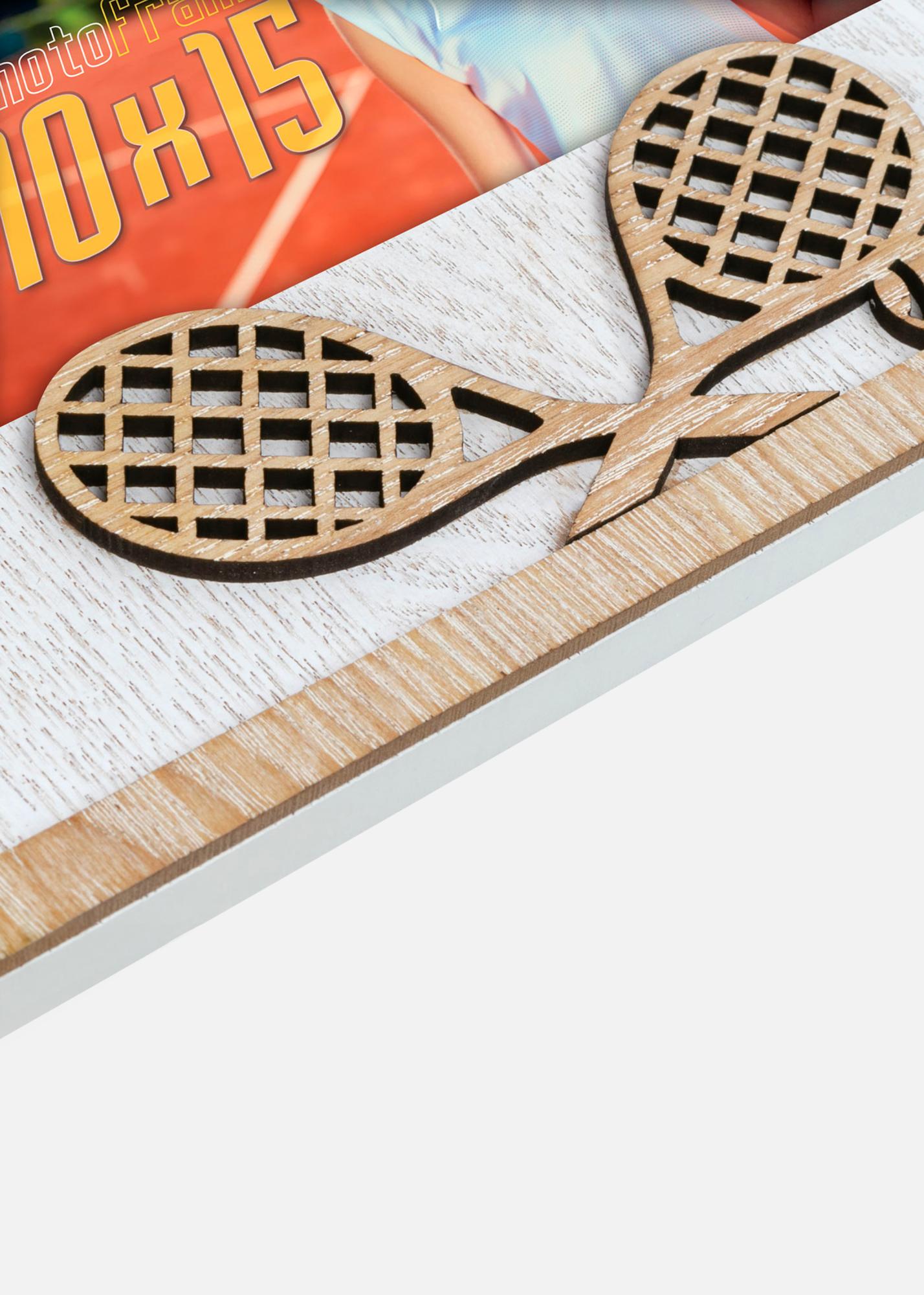Un marco de fotos inspirado en el deporte con un tema de tenis. Decorado con raquetas de tenis recortadas, perfecto para enmarcar recuerdos de la cancha de tenis o actividades deportivas. Adecuado para tamaño de imagen 10x15 cm.