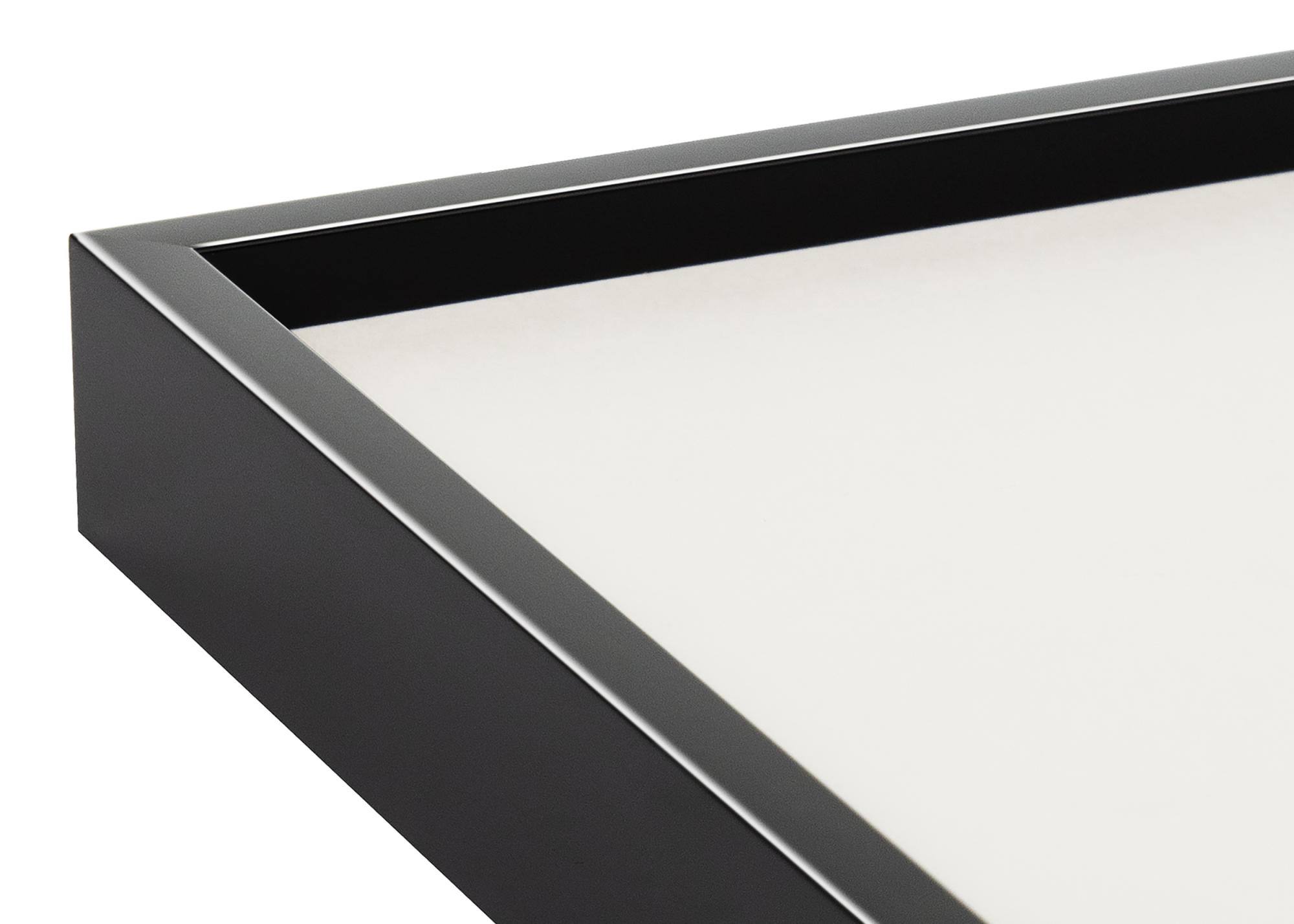 Elegante marco premium con un fino borde negro de alto brillo que se adapta perfectamente a un interior moderno y elegante. La superficie del marco y la sensación minimalista de su diseño fino lo hacen ideal para usar con pósters gráficos y fotografías en blanco y negro. El marco de la imagen está hecho de aluminio y está disponible en muchas tamaños diferentes, lo que lo convierte en una excelente opción cuando se deseas crear una pared de imágenes con diferentes formatos que se mantienen unidos por la elección del marco.