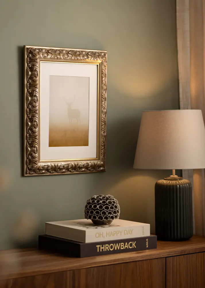 Marco Odin Plata es un marco de fotos a medida que ofrece una combinación perfecta de elegancia y funcionalidad. Con su acabado en plata antigua, detalles sutiles en oro y discretos toques rojos, este marco de fotos ofrece una expresión clásica y sofisticada que realza cualquier obra de arte o fotografía. El diseño decorativo lo hace ideal para enmarcar donde se busca una sensación elegante.