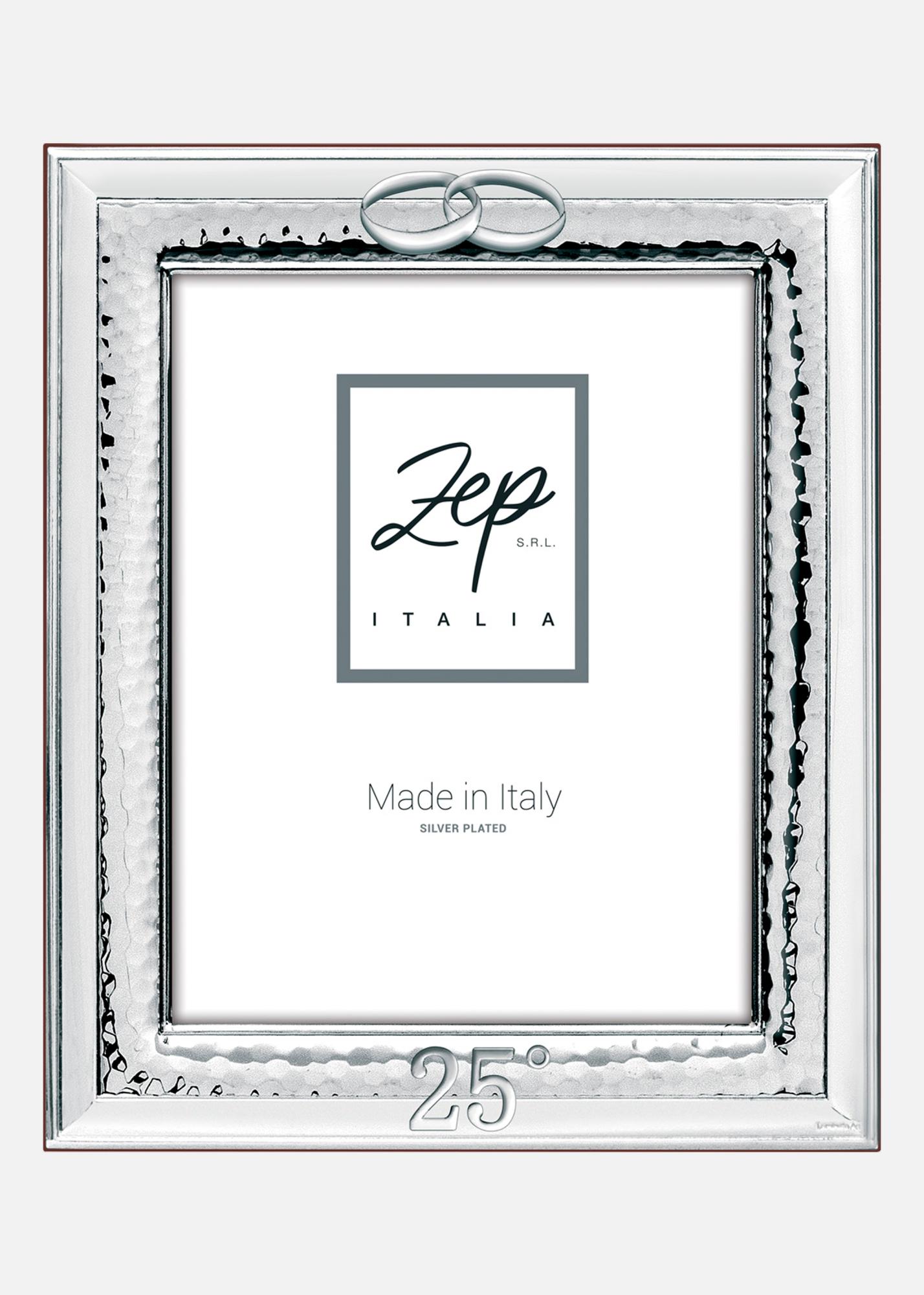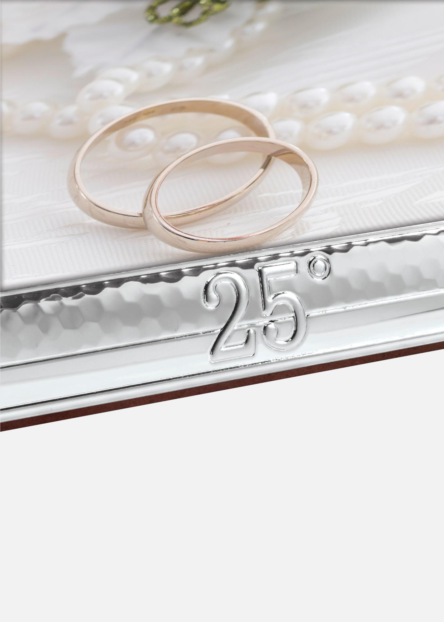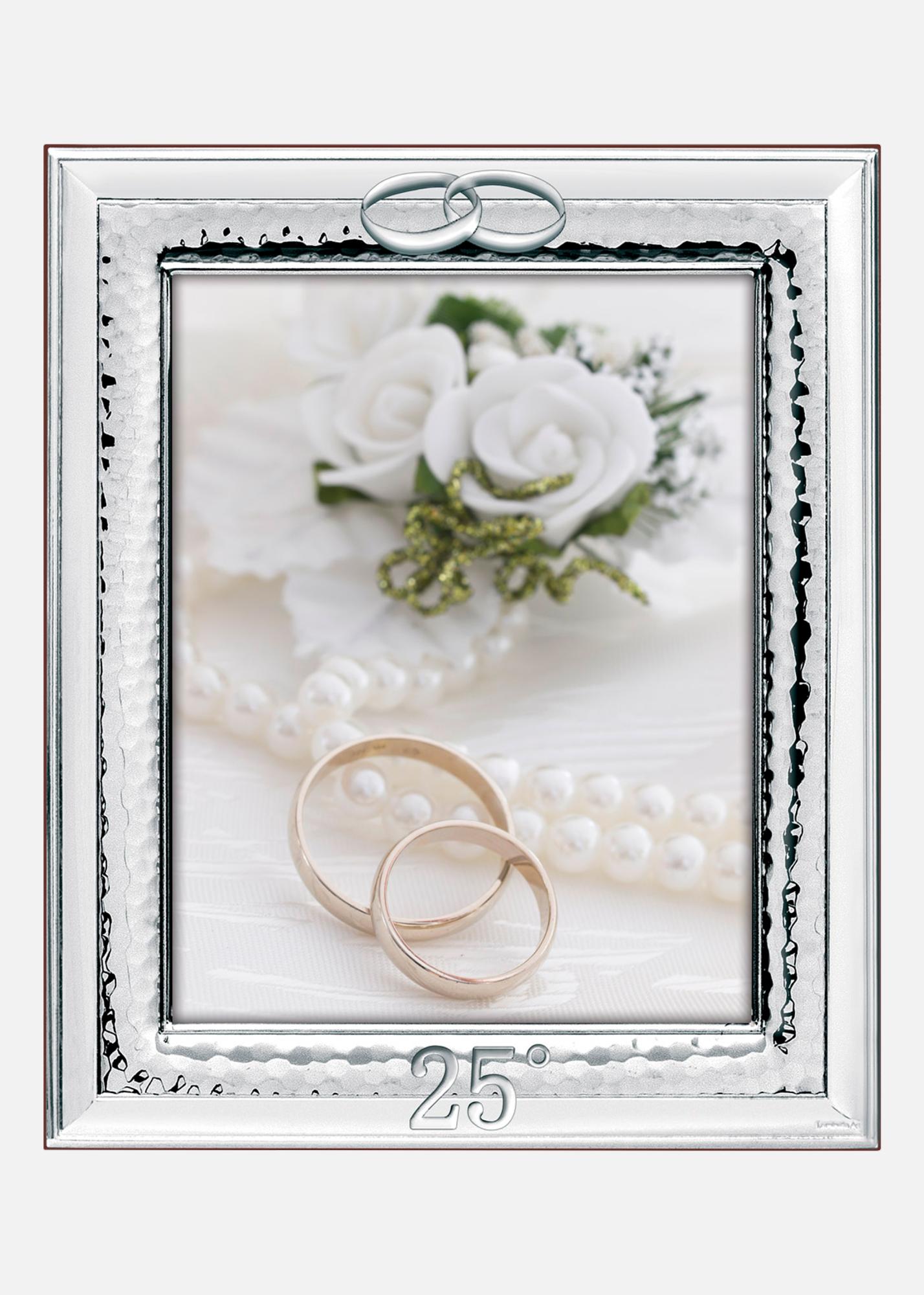 Un elegante marco de fotos plateado con tema de boda. Los anillos entrelazados en la parte superior y el número "25°" en la parte inferior lo hacen perfecto para celebrar un 25 aniversario, como unas bodas de plata.