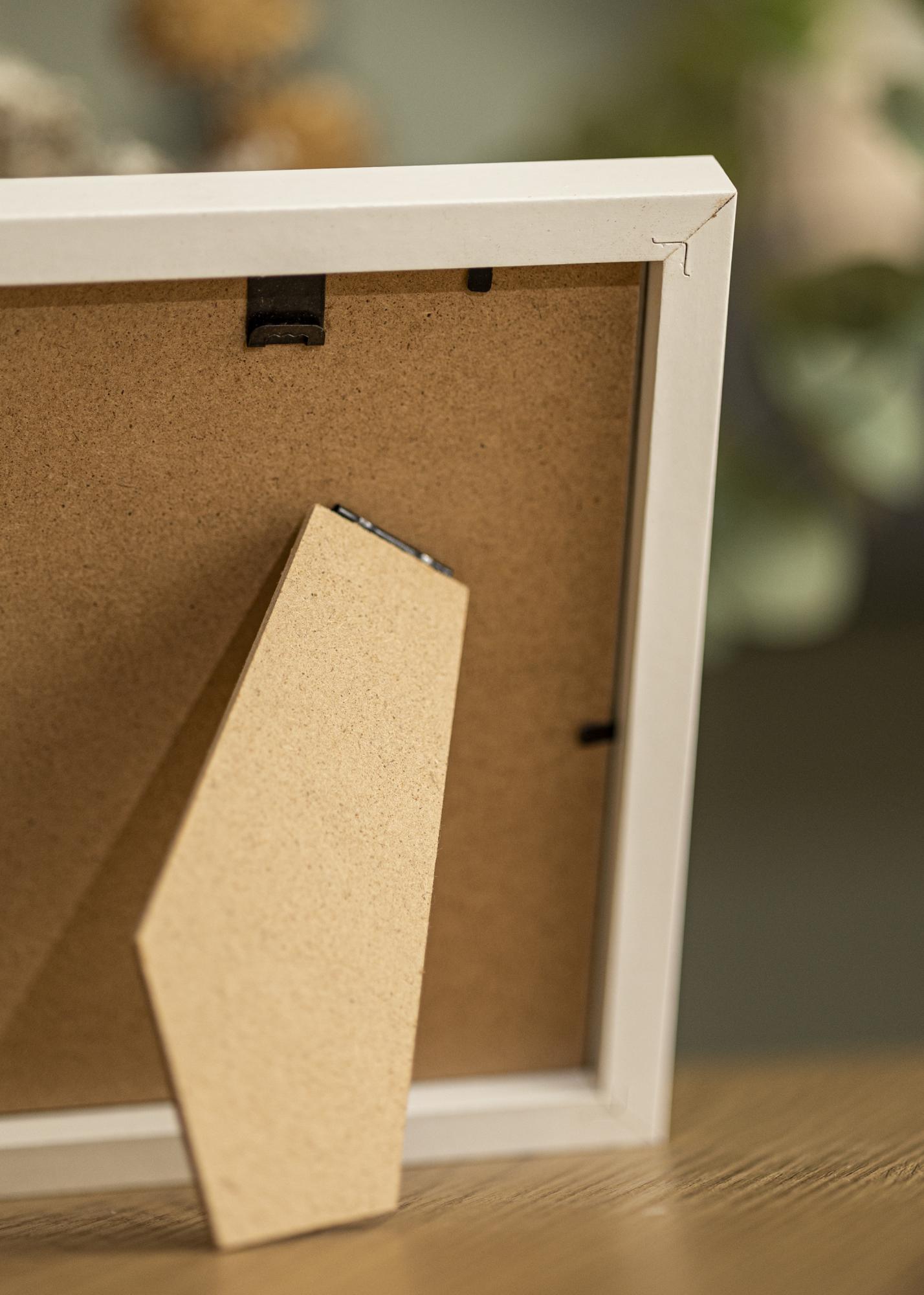 El listón del marco tiene un ancho y una profundidad de 18 mm. El color blanco se adapta bien a la mayoría de las imágenes y también es fácil de combinar con el resto de tu decoración. La parte trasera del marco se mantiene en su lugar con pequeños clavos, que puedes doblar fácilmente para quitar la placa trasera e insertar tus imágenes. En la parte trasera del marco hay prácticos soportes de pared que permiten colgar el marco tanto vertical como horizontalmente.