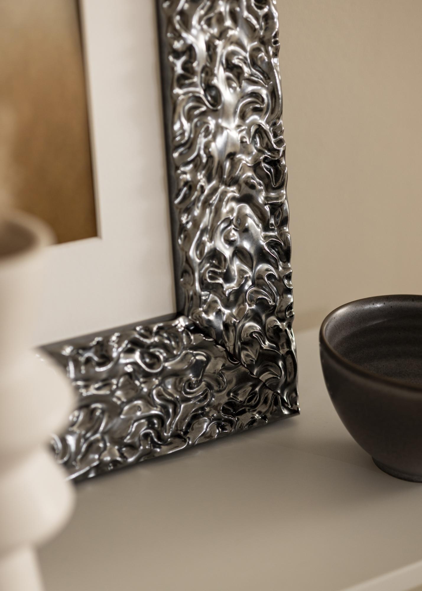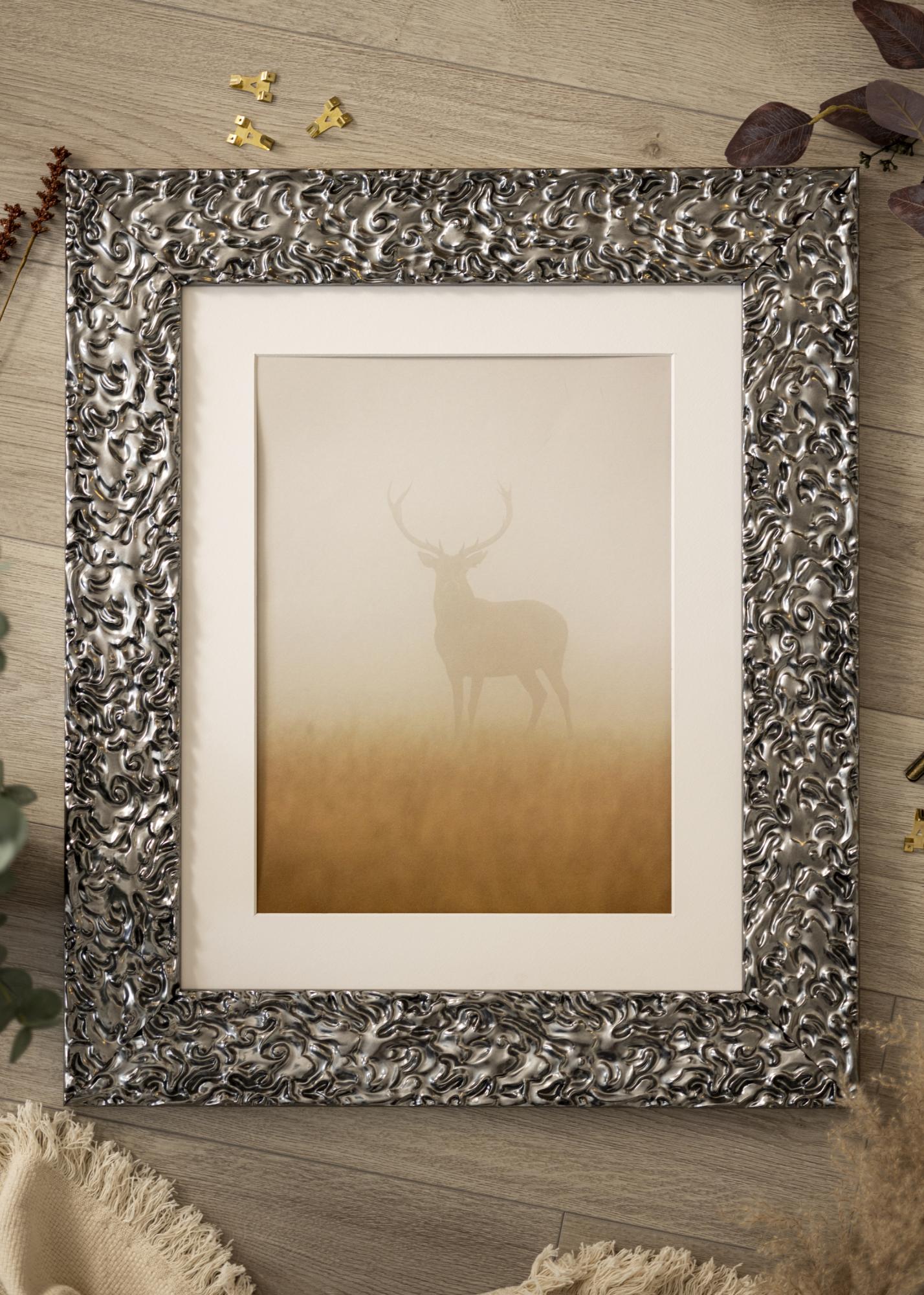 Marco Westminster Cromo es un marco a medida que se fabrica en nuestro propio taller de marcos, lo que te da la oportunidad de obtener un marco de fotos que se adapte perfectamente a tu motivo. Con su diseño audaz y elegante en acabado plateado de alto brillo, este marco se convierte en un elemento estiloso en tu hogar. La superficie reflectante y el patrón detallado crean una estructura vibrante que resalta tu motivo de manera exclusiva.
