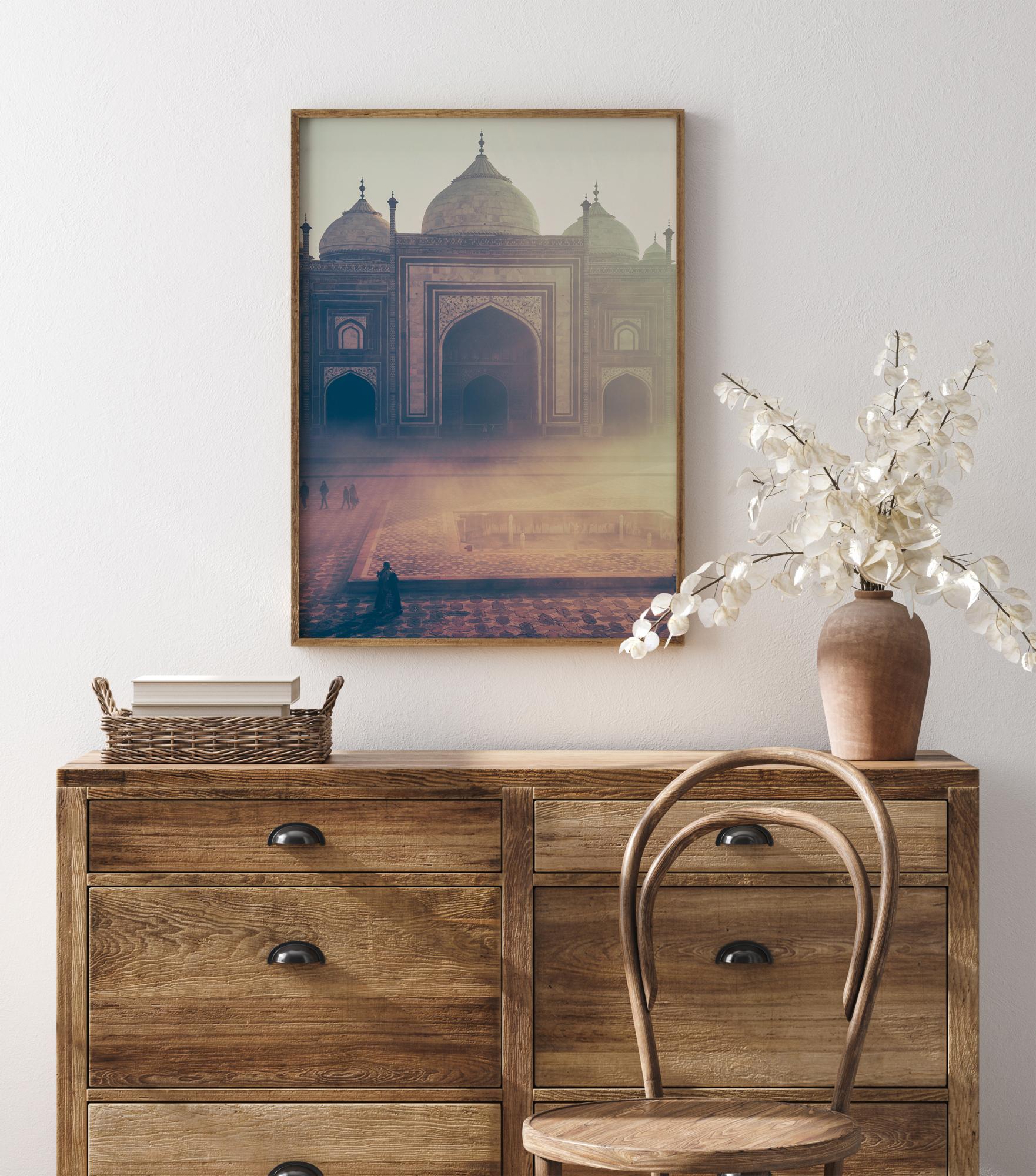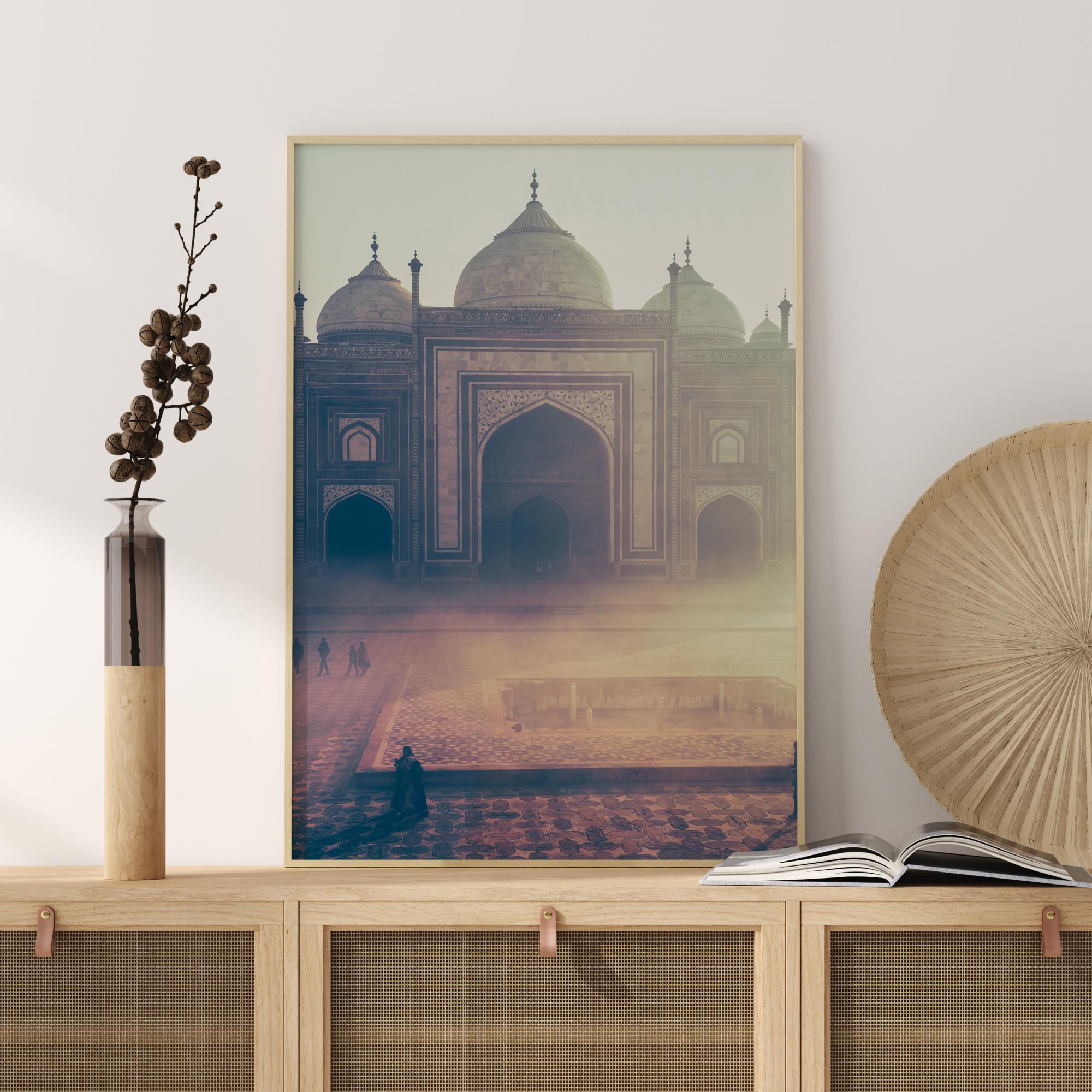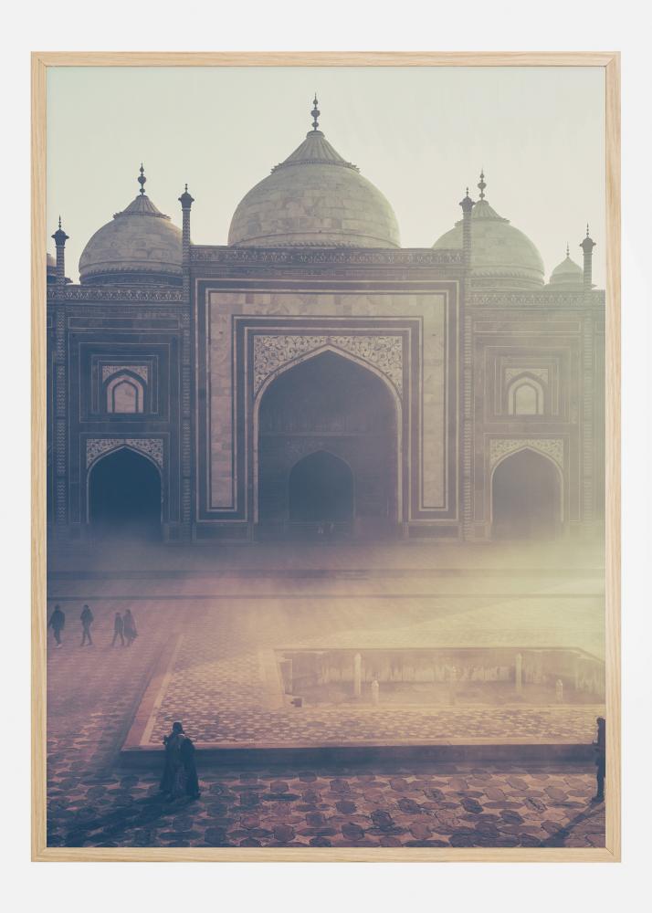El centro espiritual del mundo musulmán se muestra con orgullo tras la plaza, que aparece en primer plano. Un pequeño grupo de personas camina alrededor de la plaza a través de una niebla persistente intensamente iluminada. La entrada principal a la mezquita está flanqueada por entradas más pequeñas a la izquierda y a la derecha. Un póster pacífico que crea un ambiente apacible.