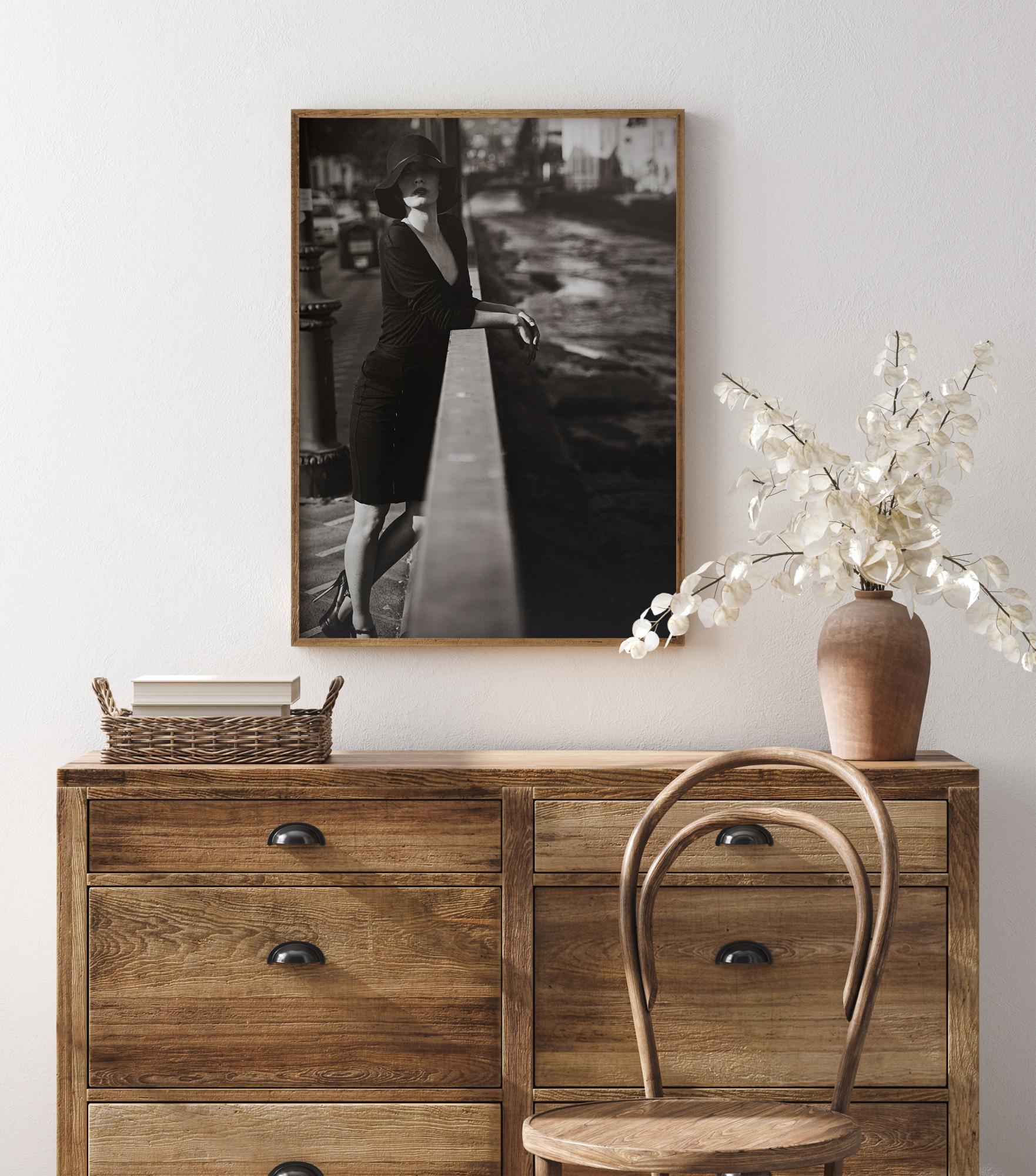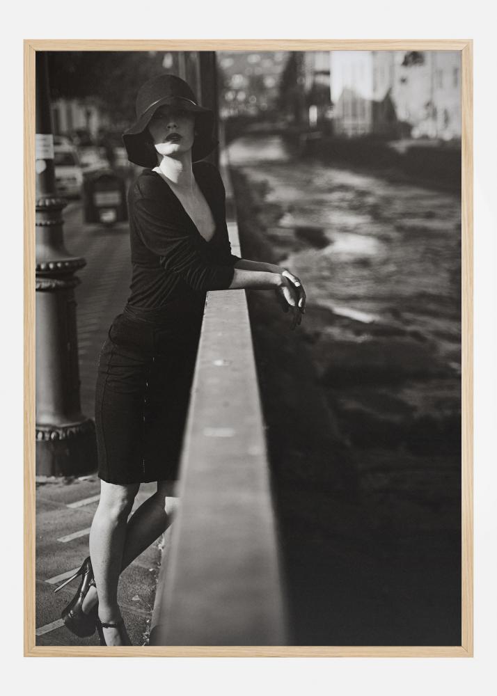 Un retrato de una mujer apoyada en una pared. Esta fantástico foto irradia clase y captura una elegancia relajada como ninguna otra. Coloca este póster en la pared para obtener una sensación agradable de los años 30.