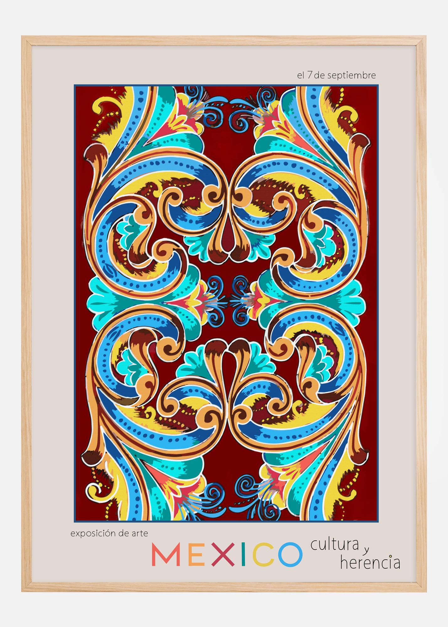 Este póster vibrante y colorido celebra una exposición de arte en México. Su diseño está inspirado en patrones tradicionales mexicanos, lleno de curvas ondulantes y exuberantes motivos florales que invitan al ojo a bailar sobre la imagen. Los ricos colores rojo, amarillo y azul son típicos del arte folclórico mexicano y simbolizan la cultura y el patrimonio de la nación con un toque moderno.