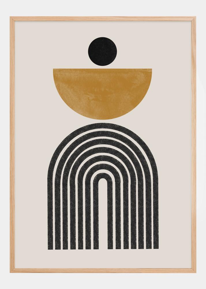 Sumergete en un mundo de abstracción y simetría con nuestro póster moderno que presenta una serie de arcos en blanco y negro bajo un semicírculo dorado en forma de sol, coronado por un círculo negro. Esta impresión es un homenaje a la claridad del arte moderno y a la simplicidad del diseño geométrico, aportando un toque sofisticado a tu decoración. Los colores están valientemente reducidos para resaltar el contraste y el peso visual de cada forma.