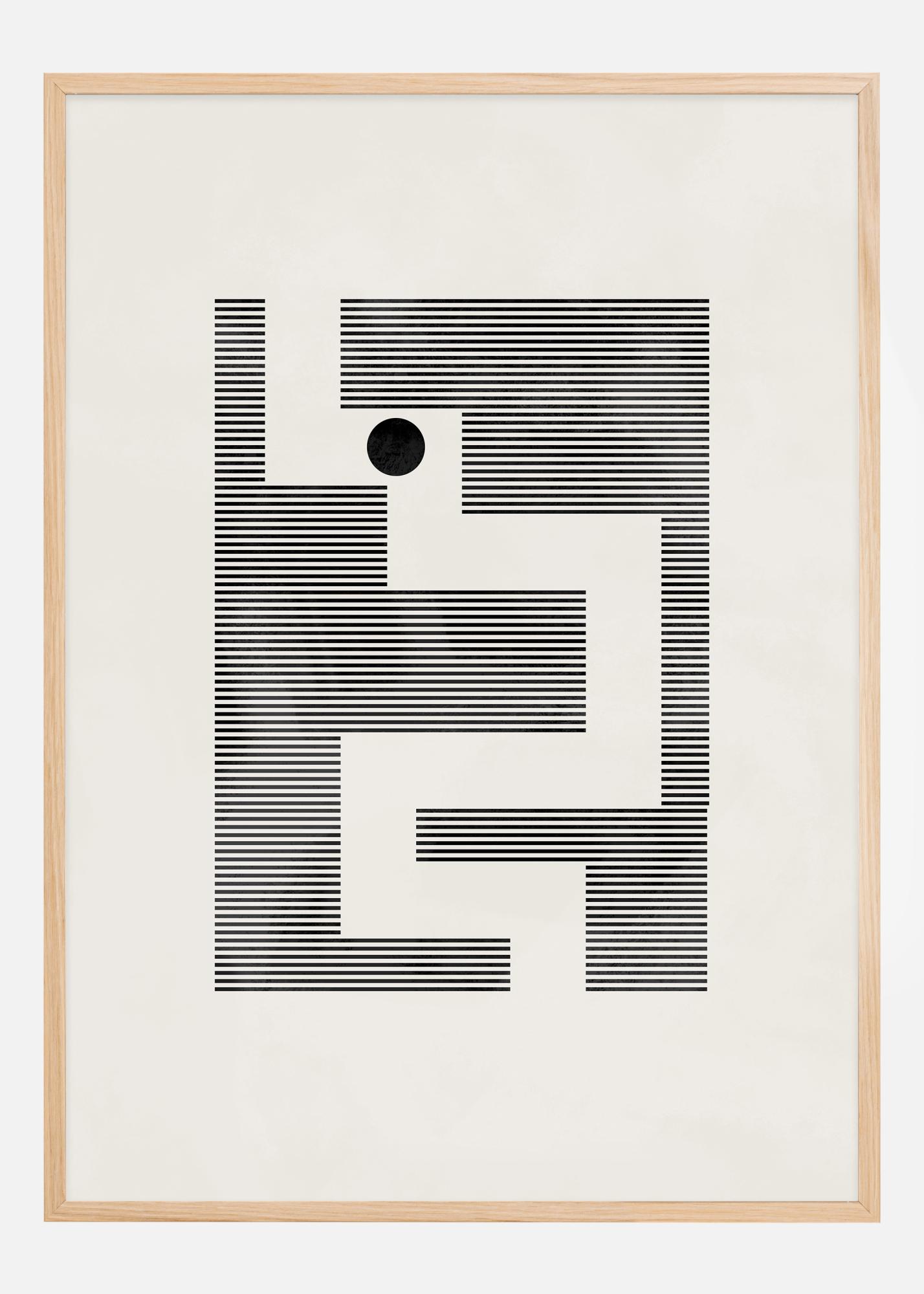 Este póster artístico ofrece una interpretación minimalista de un laberinto, realizado con líneas negras que forman una intrincada trama de formas geométricas sobre un fondo color crema. El solitario círculo negro colocado en el centro del laberinto funciona como un punto de anclaje visual, al mismo tiempo que ofrece profundidad y enfoque al motivo que de otro modo sería simple. Este diseño juega con el ojo del espectador y fomenta una exploración visual de sus caminos y callejones sin salida.