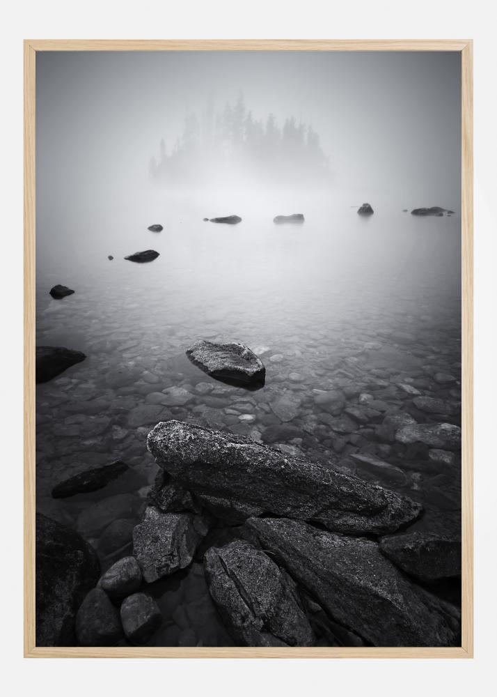 Un misterioso póster de naturaleza con rocas y un lago brumoso. Imagina lo que hay más allá cuando miras la isla cubierta de árboles brumosos. Haz tu hogar mágico con esta fantástico impresión en una pared azul.