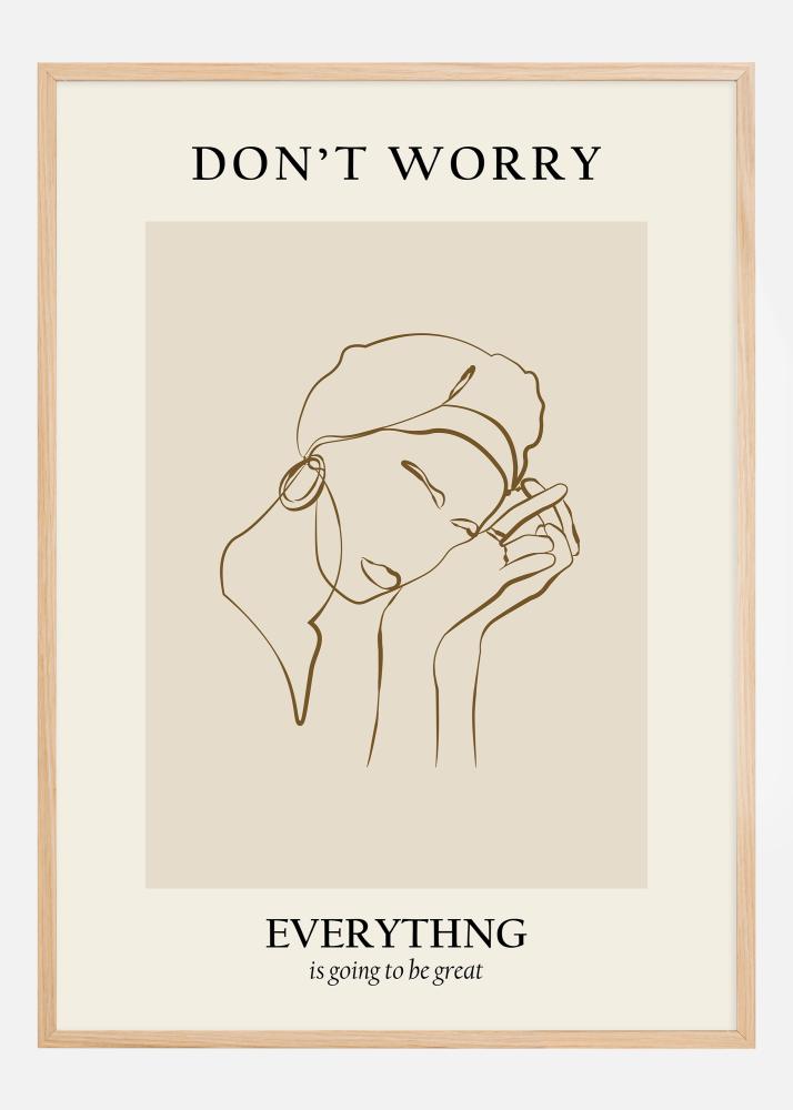 Este póster artístico captura un momento tranquilo de reflexión y paz interior a través de un dibujo lineal de una persona que sostiene su mano contra su rostro. El texto "NO TE PREOCUPES" en letras grandes trasciende la imagen y proporciona un recordatorio tranquilizador, mientras que "TODO va a estar bien" refuerza el mensaje con un tono más reflexivo. Esta obra de arte moderna es perfecta para crear una sensación de calma y optimismo en el hogar o en la oficina.