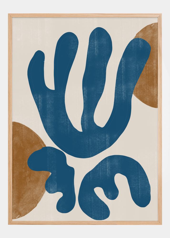 Este póster vibrante combina formas atrevidas y una paleta de colores terrosos para crear una sensación tanto de arte moderno como de maravillas naturales. Las grandes y fluidas formas azules evocan pensamientos de agua o vegetación, mientras que los detalles ocres aportan un contraste cálido y natural. Este diseño es un excelente ejemplo de cómo el arte abstracto puede imitar y celebrar los patrones orgánicos de nuestro entorno.